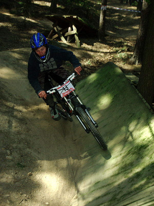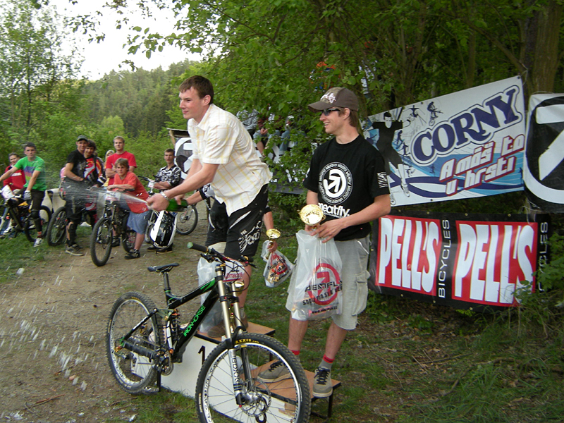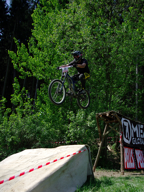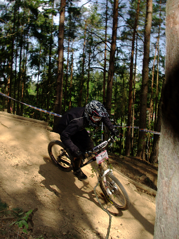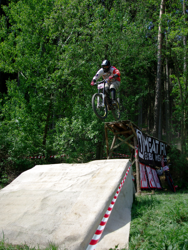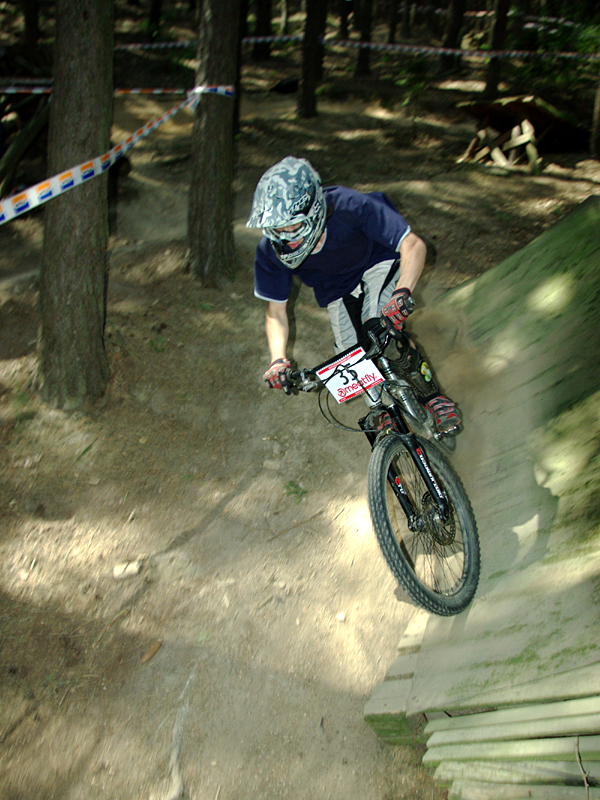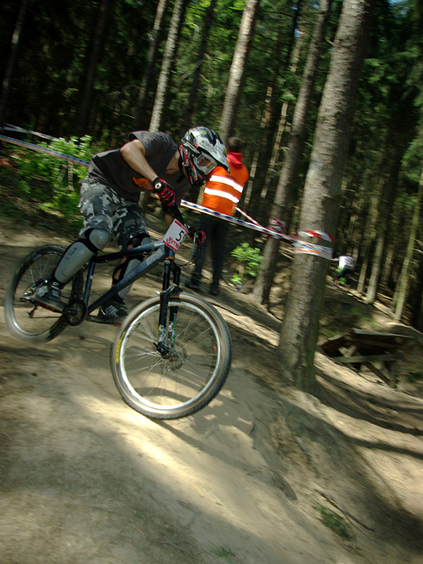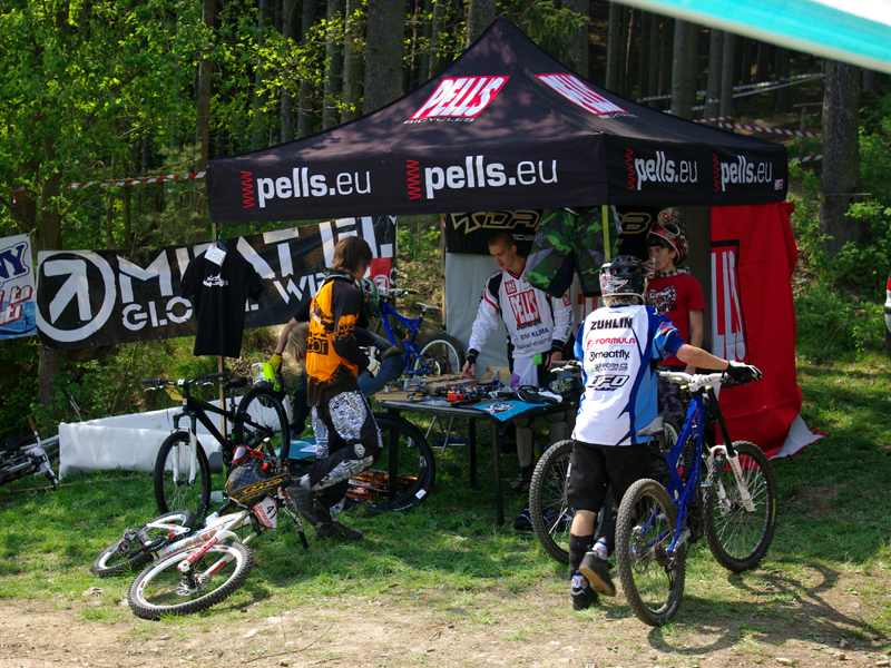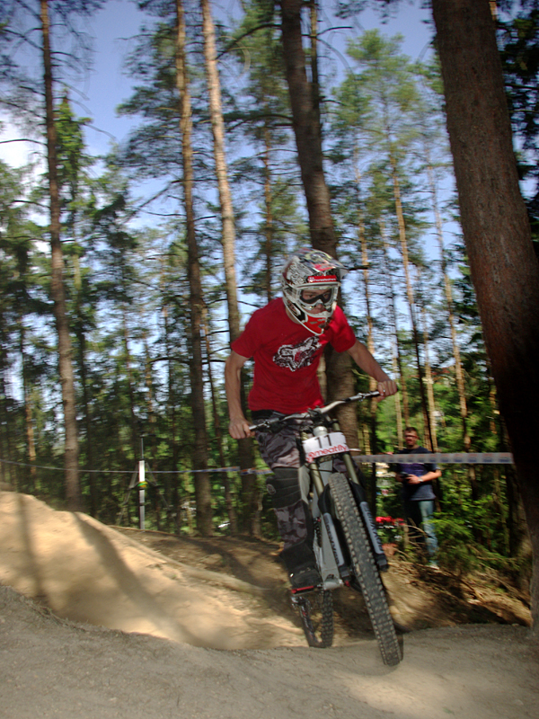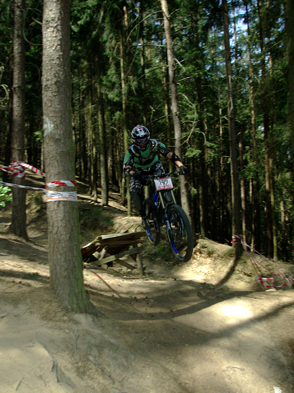 Když sem ho v 6 viděl na nohou, nevěřil sem. Je to ostřák. My neodmítli delší vyspání a tak jsme přišli na místo dění až kolem půl desáté. To už byl trénink v plným proudu, hudba hrála a ladily se poslední detaily. Postavili jsme stánek, já složil kolo a že si to teda půjdu sjet. Díky stále probíhající léčbě boreliózy, kvůli které mě doktoři naordinovali klid, jsem si řekl, že se nebudu přepínat a dám si každou trať jednou. Brzo sem zjistil, že na čerstvě poskládaným Intensu, to nebude jen tak a že na sžití s novým kolem by to chtělo víc. Ale sranda musí být a tak sem čekal na závodní jízdu. Tygr mě šoupl po předchozí domluvě jako předjezdce, a tak jsem plnej ambicí vyrazil. Jako byla to pecička, sice sem na tom seděl obráceně, ale držel sem to u huby a s vidinou vítězství na práškách jsem skejtoval dolů. Žel bohu mě vystavil stopku špatně nastavenej napínák (hned sem dole vyhodil team mechanika – mě) a to na nejlepším místě, na začátku nenáviděné sprint rovinky. Koloběžka stylem sem ji překonal a celou dobu sem přemýšlel jestli půjde cílovej drop dát bez řetězu nebo ne. Mincí házet nešlo a tak bylo rozhodnutí jen a jen na mě. Při nájezdu na něj sem si řekl, že nechci jít ve stopách Keliho, kterej z něj v loni dal ukázkový fróňo na záda, a raděj jsem ho objel. Zajistil sem si tak krásnej čas do dalších bojů a těšil se na druhou jízdu.