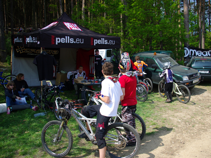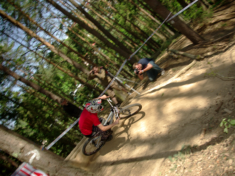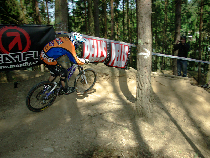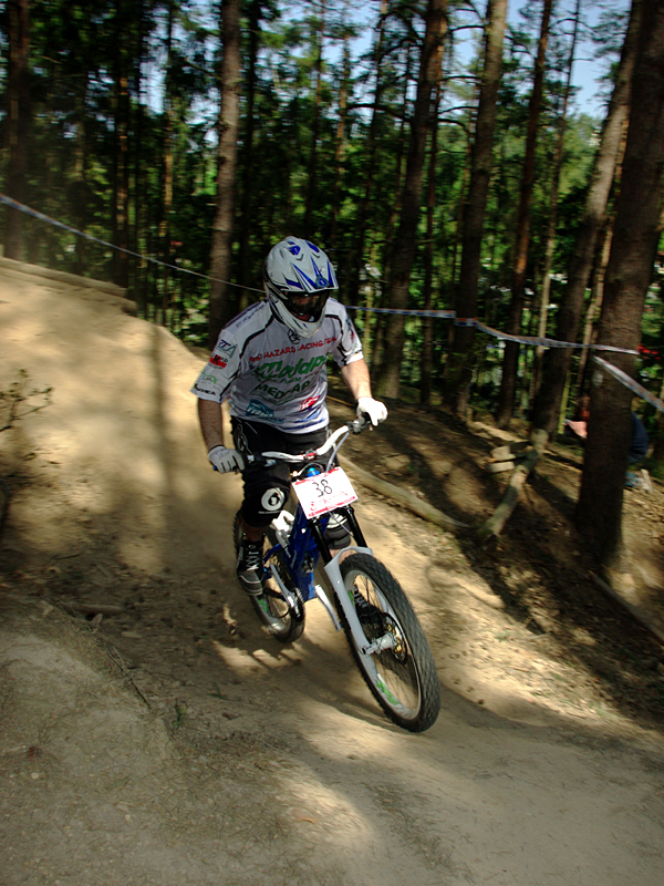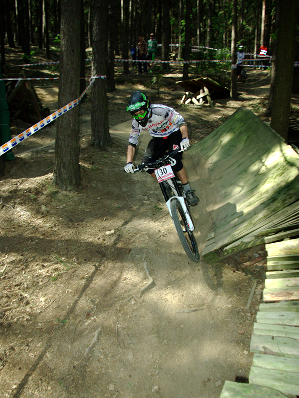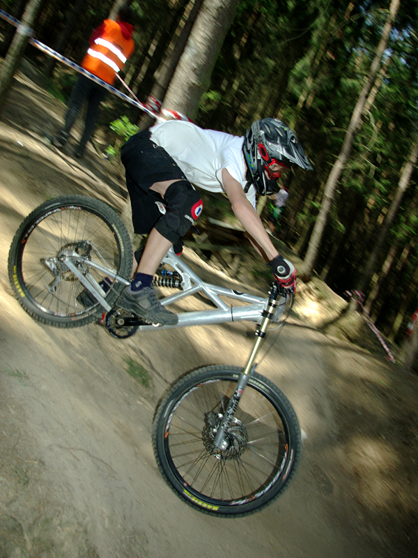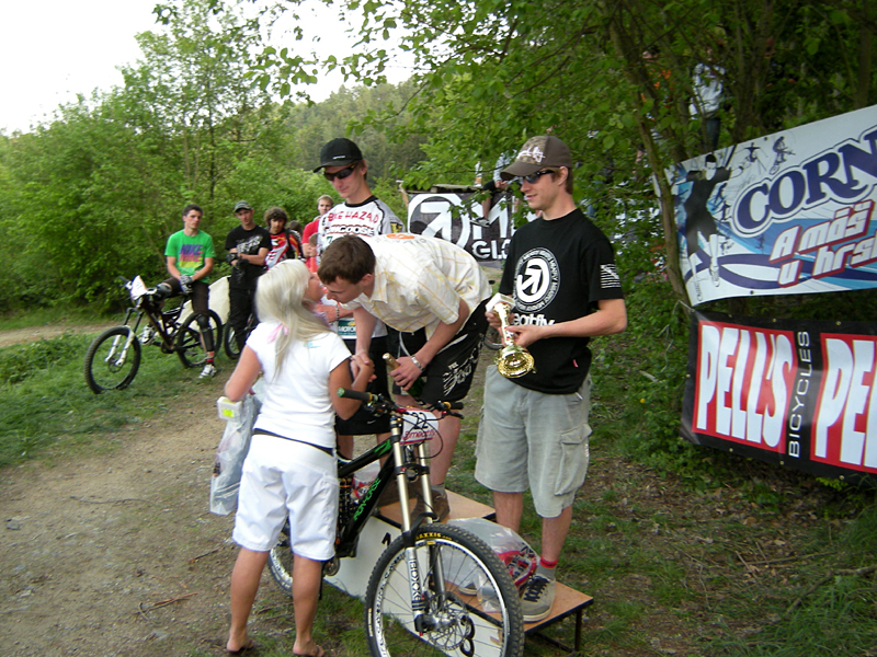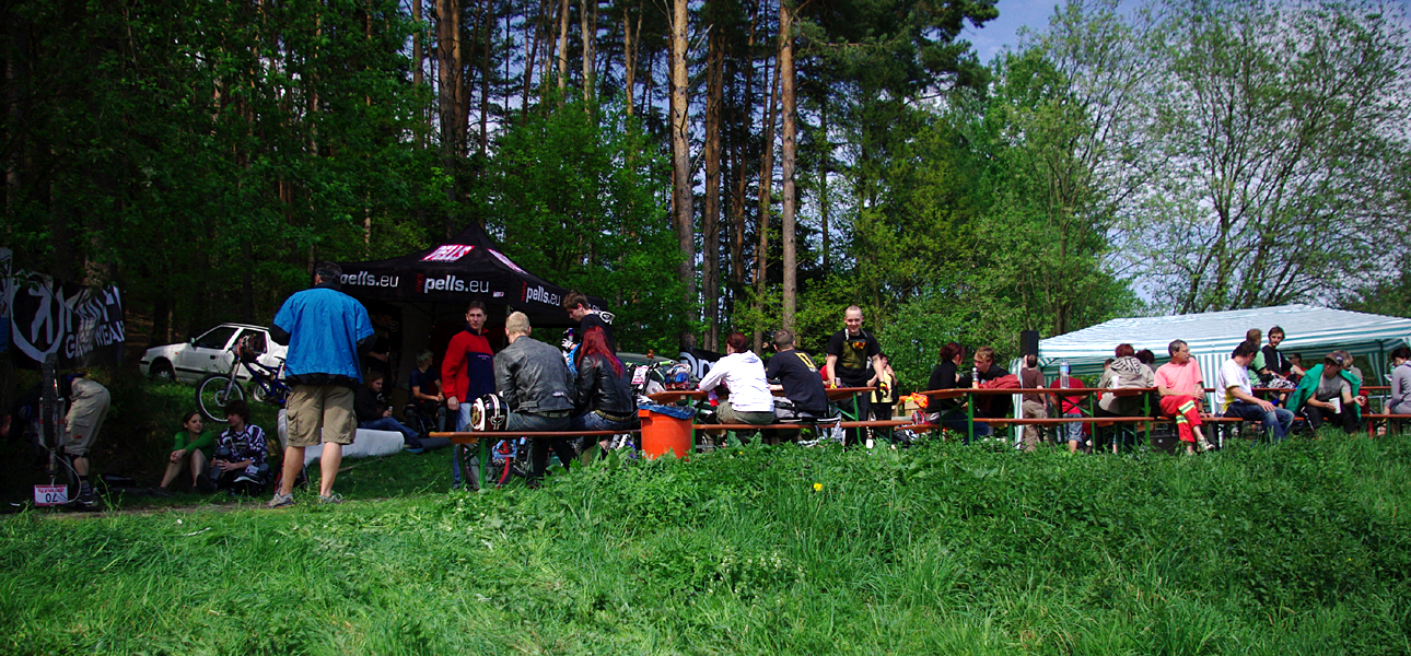 Když sem ho v 6 viděl na nohou, nevěřil sem. Je to ostřák. My neodmítli delší vyspání a tak jsme přišli na místo dění až kolem půl desáté. To už byl trénink v plným proudu, hudba hrála a ladily se poslední detaily. Postavili jsme stánek, já složil kolo a že si to teda půjdu sjet. Díky stále probíhající léčbě boreliózy, kvůli které mě doktoři naordinovali klid, jsem si řekl, že se nebudu přepínat a dám si každou trať jednou. Brzo sem zjistil, že na čerstvě poskládaným Intensu, to nebude jen tak a že na sžití s novým kolem by to chtělo víc. Ale sranda musí být a tak sem čekal na závodní jízdu. Tygr mě šoupl po předchozí domluvě jako předjezdce, a tak jsem plnej ambicí vyrazil. Jako byla to pecička, sice sem na tom seděl obráceně, ale držel sem to u huby a s vidinou vítězství na práškách jsem skejtoval dolů. Žel bohu mě vystavil stopku špatně nastavenej napínák (hned sem dole vyhodil team mechanika – mě) a to na nejlepším místě, na začátku nenáviděné sprint rovinky. Koloběžka stylem sem ji překonal a celou dobu sem přemýšlel jestli půjde cílovej drop dát bez řetězu nebo ne. Mincí házet nešlo a tak bylo rozhodnutí jen a jen na mě. Při nájezdu na něj sem si řekl, že nechci jít ve stopách Keliho, kterej z něj v loni dal ukázkový fróňo na záda, a raděj jsem ho objel. Zajistil sem si tak krásnej čas do dalších bojů a těšil se na druhou jízdu.