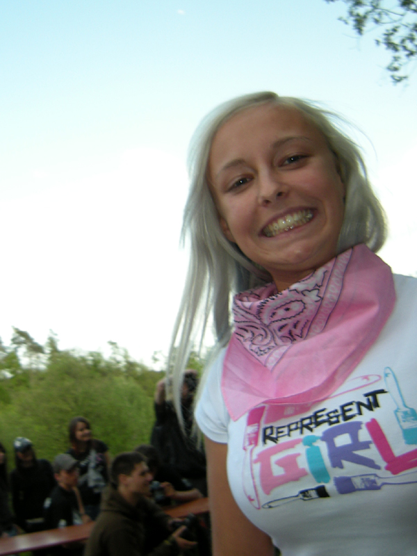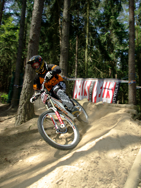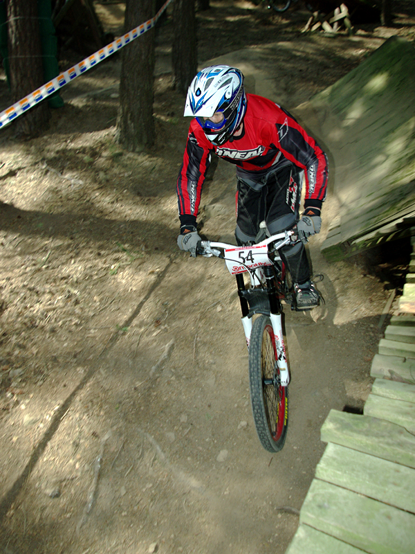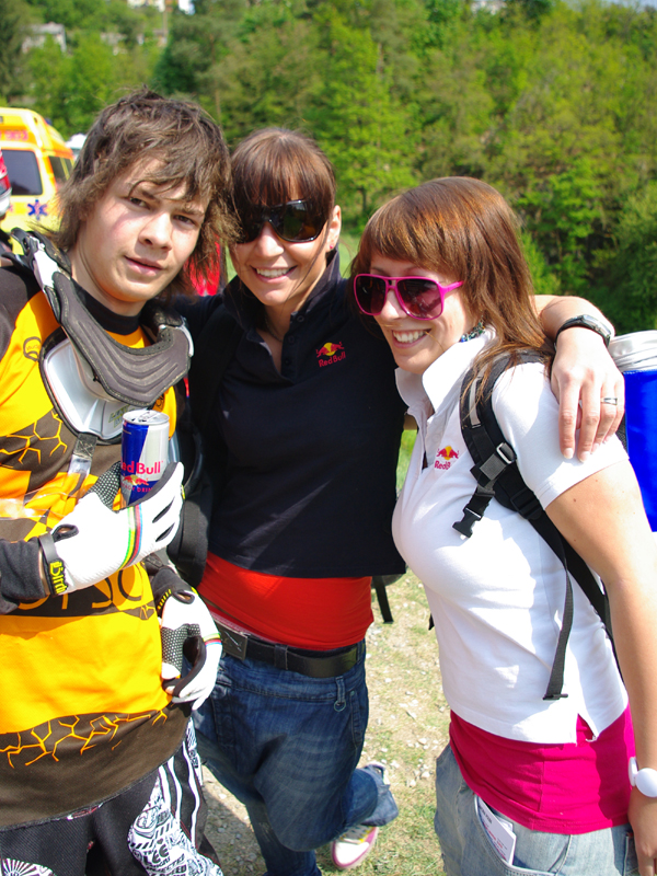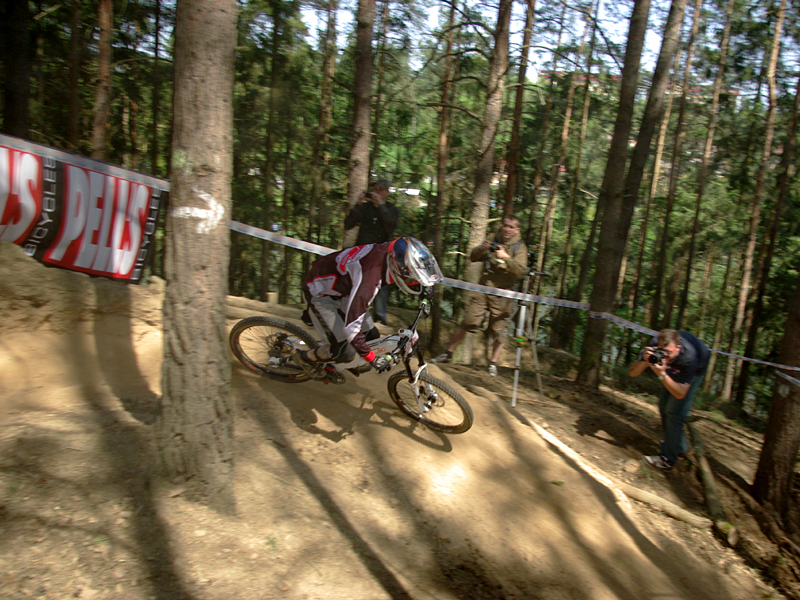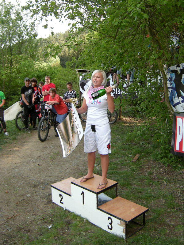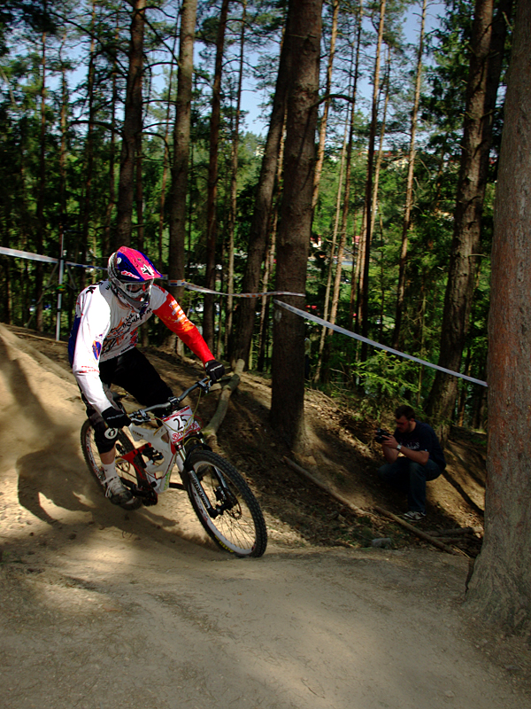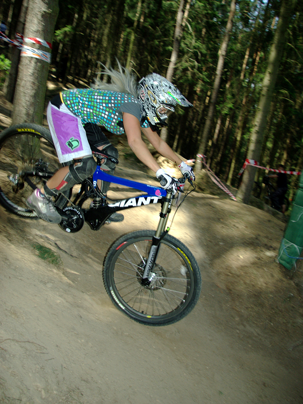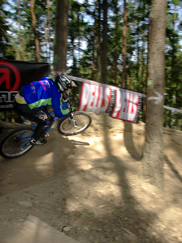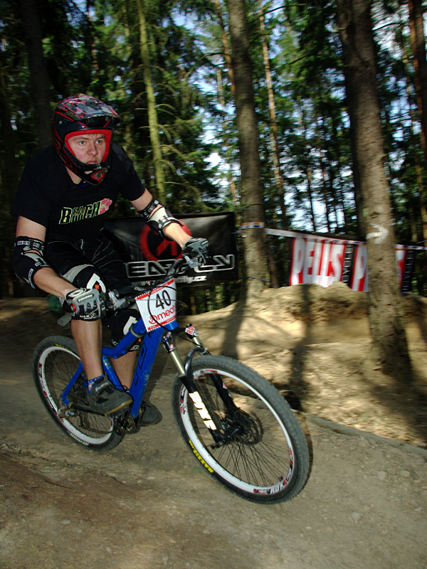 Když sem ho v 6 viděl na nohou, nevěřil sem. Je to ostřák. My neodmítli delší vyspání a tak jsme přišli na místo dění až kolem půl desáté. To už byl trénink v plným proudu, hudba hrála a ladily se poslední detaily. Postavili jsme stánek, já složil kolo a že si to teda půjdu sjet. Díky stále probíhající léčbě boreliózy, kvůli které mě doktoři naordinovali klid, jsem si řekl, že se nebudu přepínat a dám si každou trať jednou. Brzo sem zjistil, že na čerstvě poskládaným Intensu, to nebude jen tak a že na sžití s novým kolem by to chtělo víc. Ale sranda musí být a tak sem čekal na závodní jízdu. Tygr mě šoupl po předchozí domluvě jako předjezdce, a tak jsem plnej ambicí vyrazil. Jako byla to pecička, sice sem na tom seděl obráceně, ale držel sem to u huby a s vidinou vítězství na práškách jsem skejtoval dolů. Žel bohu mě vystavil stopku špatně nastavenej napínák (hned sem dole vyhodil team mechanika – mě) a to na nejlepším místě, na začátku nenáviděné sprint rovinky. Koloběžka stylem sem ji překonal a celou dobu sem přemýšlel jestli půjde cílovej drop dát bez řetězu nebo ne. Mincí házet nešlo a tak bylo rozhodnutí jen a jen na mě. Při nájezdu na něj sem si řekl, že nechci jít ve stopách Keliho, kterej z něj v loni dal ukázkový fróňo na záda, a raděj jsem ho objel. Zajistil sem si tak krásnej čas do dalších bojů a těšil se na druhou jízdu.