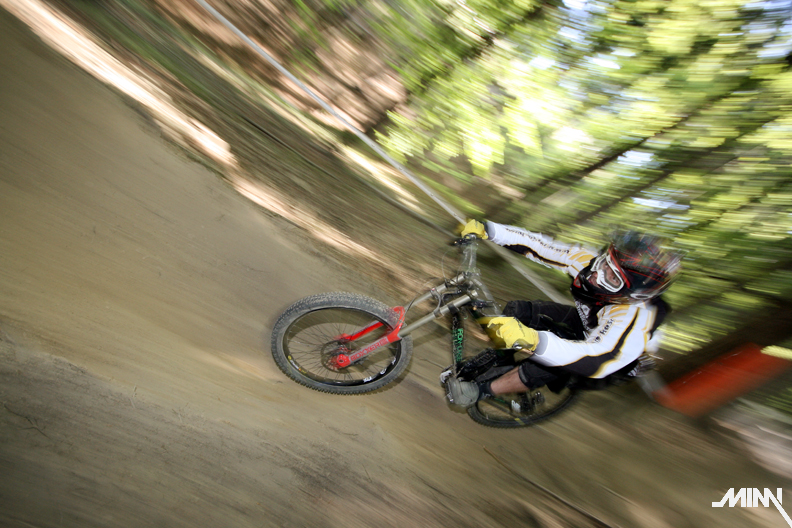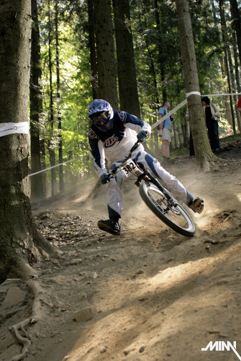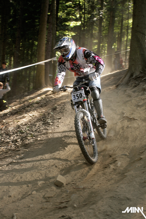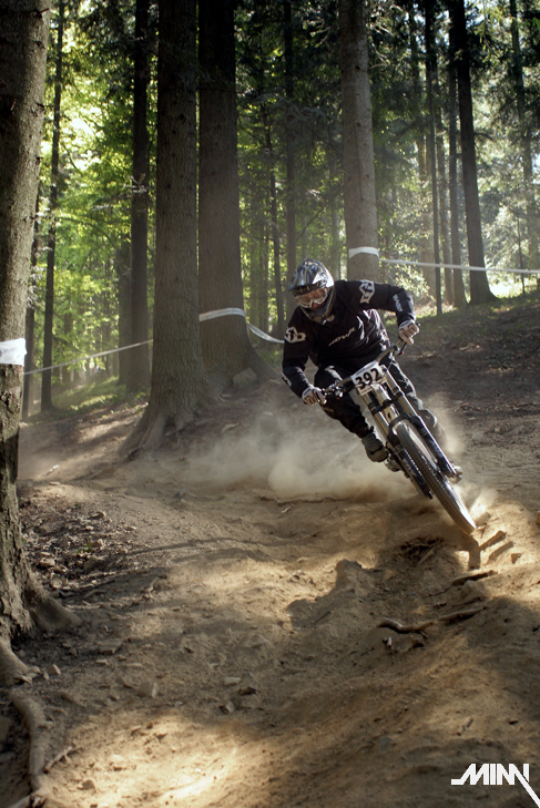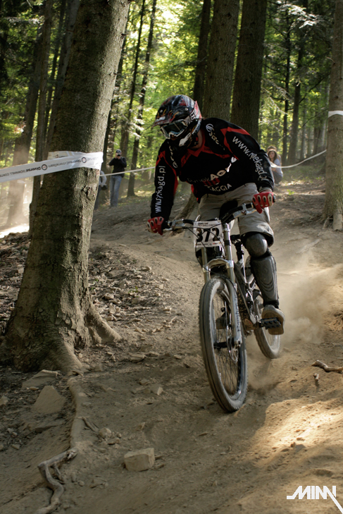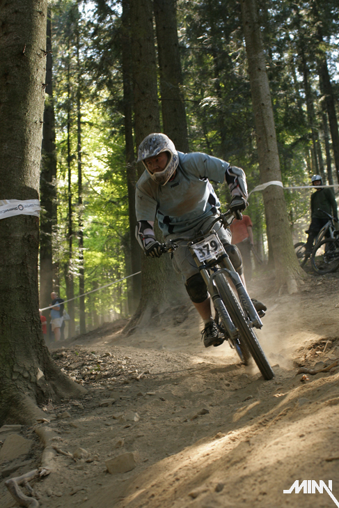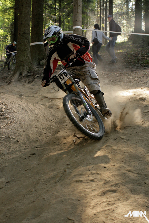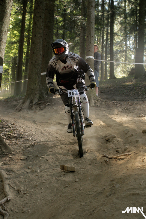 Ráno po kratšom prehováraní Mimky, že už ozaj musíme ísť sa konečne presúvame k trati. Cestou stretávame chalanov z polcsterracing teamu, ktorí nám ukazujú smer k správnej lanovke. Auto sme zaparkovali dolu na parkovisku a plný očakávania sme sa vydali na trať. Tá je enormne suchá, čo má za následok tony prachu, ktorý počas celého víkendu musíme dýchať. Nám to však vôbec neprekáža a tešíme sa na prvú jazdu. Cestou hore ešte pozorujeme dvojicu poľských jazdcov, ktorí si to tam dávajú akoby tam jazdili celý život. Za nimi jazdci z novatecracing teamu, ktorí tam očividne tiež nejazdia prvý deň. Stíhame pozrieť tak polku trate, keďže po zime sme na jazdenie nadržaní ako stepné kozy na vodu v období sucha! Raketovou rýchlosťou schádzame dolu a skladáme biky. Mimka spakuje fototechniku a vyrážame lanovkou hore. Musím uznať, že poliaci vedia stavať výborné trate – zábavné, hravé a zároveň technicky náročné (samé zákruty, klopky, vlnky a jumpy). Z kopca sme si to teda užívali ako sa dalo. Taktiež sme si užili pohľad na Mimku, ktorá sa postarala o zábavu väčšiny okoloidúcich. Cestou hore zapadla asi do jediného blata v okruhu 500 km. Musela sa vyzuť, vybrať topánky a odkráčať bosá do lesa. Tomu predchádzala 15 minútová snaha vytiahnuť nohy von z bahna, čo nezvládla jej rovnováha a spadla tam aj rukami. Keď sa márne pokúšala vytiahnuť ruky, spadol jej tam aj foťák. Chceli sme k nej hodiť ešte jednu babu, no kto už by potom bol zvedavý na preteky? Na naše šťastie sa však stihla dať rýchlo dokopy a nafotiť par pekných záberov. Takže v sobotu stíhame dať desať jázd, viac sa nám už v tom prachu nechce a spokojne odchádzame na penzión. Zajtra nás čaká náročný deň, takže padlo rozhodnutie – žiadna kalba sa nekoná.