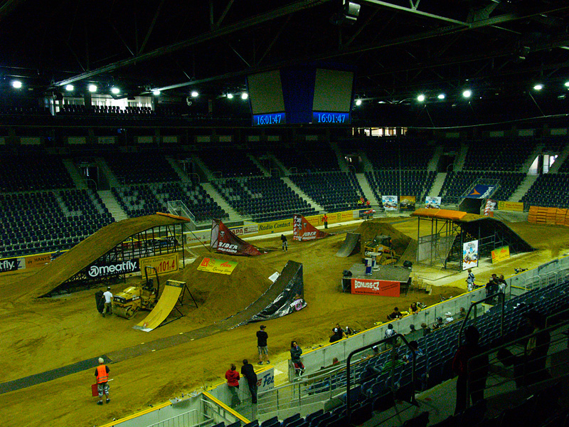 Do arény přijíždíme se Zuzkou v sobotu už kolem jedné hodiny, zaparkujem v zákazu vjezdu a jdeme se rovnou poohlédnout po PRESS ROOMU, kde si chceme vyzvednout akreditace. V chodbě v aréně za střídačkou jsou troje dveře, v jedněch je šatna FMX rajdrů, na dalších je nápis Cattering a na třetích „něco“office. Nakonec pro nás vítězí dveře s jídlem, ovšem v místnosti je pouze pár poházených kelímků, kartóny s pitím a nějaký oschlý koblihy.