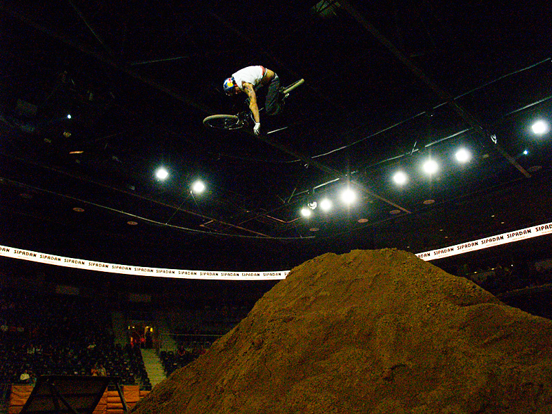 V poslední části exhibice Kuba Vencl na velkým kole roztáčí 720, kterou už odjíždí spolehlivě do molitanu, ale bohužel ještě něco málo chybí a končí dvakrát na zemi. 720 je prej pro Ondru Šléze málo, tak točí 1080, ale odjíždí ji ve štýlu po zadku! Zlatý hřeb večera, na který pořadatelé závodu nezapomněli lákat diváky, byl „doublebackflip na horském kole (dvojité salto vzad i s kolem)“ v provedení koho jiného než španělského plejboje Lacondeguye. Trochu si šoupnul odraz prvního dirtu blíž k dopadu, párkrát si zkusil jen tak nanečisto jednoduchý beko a nakonec to tam vyslal! Neskutečná rychlost, PEKLO a doublebackflip byl na světě! Je to fakt korunovanej magor!