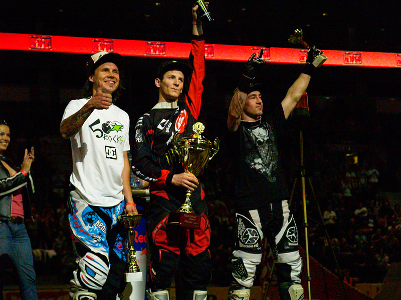 …dále například to, že Libor Podmol má mikádo a sluší mu to a Lacondeguy je snad na tý motorce ještě víc k sežrání než na kole :-) Všichni jezdci podávali strhující výkony, ale nakonec s hodnocením 97 bodů vyhrává Remi Bizouard, druhý je Libor Podmol s trikem “underflip to mantinel“ a třetí William Van den Putte. Za své výkony si odvážejí poháry, na které pořadatelé lihovkou! napsali „Liberec 2009“.