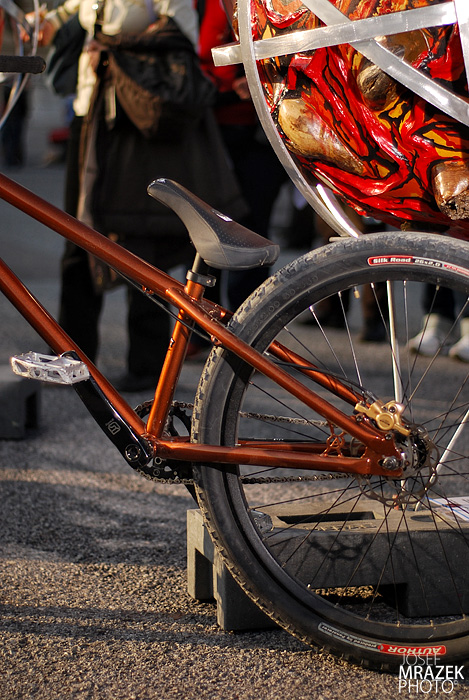 Snažil jsem se udělat delší řetěz, aby se prodloužila zadní stavba, což mi vyhovuje. Z komponentů bych rozhodně vypíchnul sedlo, který má perfektní tvar a nový pedály. Oboje by mělo jít časem do prodeje. Další přijemnou změnou jsou lehoučký mtb kliky, který po třech letech dostaly přednost před bmx typem a rozhodně to byla změna k lepšímu.