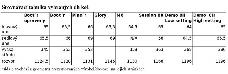 Katalogově osazený Bootr a Bootr Team mají hlavový úhel 65,5º, po instalaci nového delšího freedom linku by se tak měl dostat na 65º. Pinn´r v obou svých verzích Apprentice a Foreman mají hlavovku 66º, takže se instalací delšího freedom linku dostanou na sjezdovějších 65,5º. Úhly vycházejí z originálních specifikací, při použití jiné vidlice nebo korunek se může hlava ještě více položit.