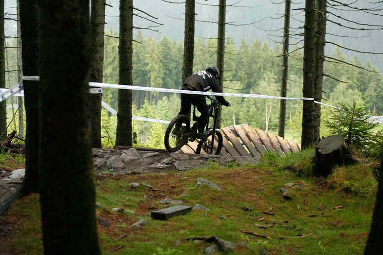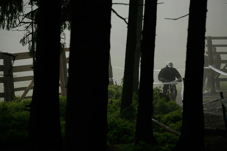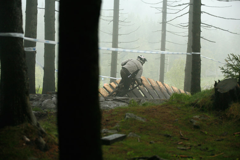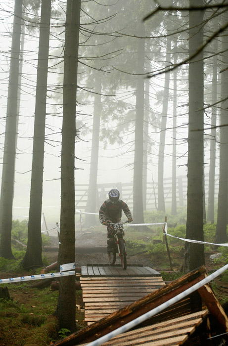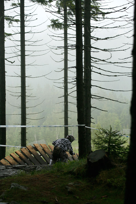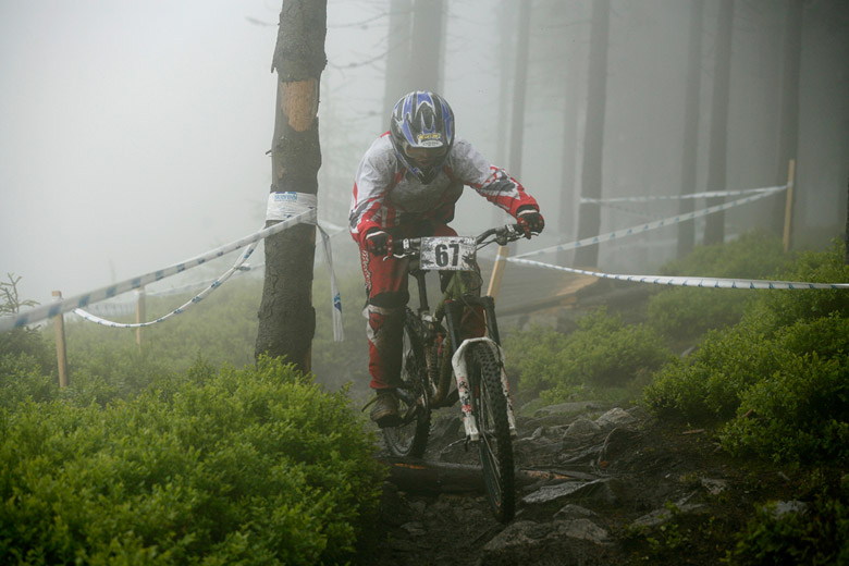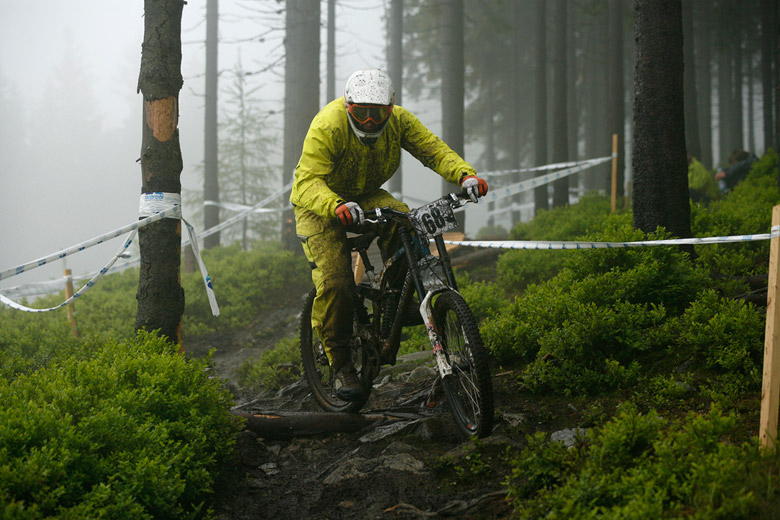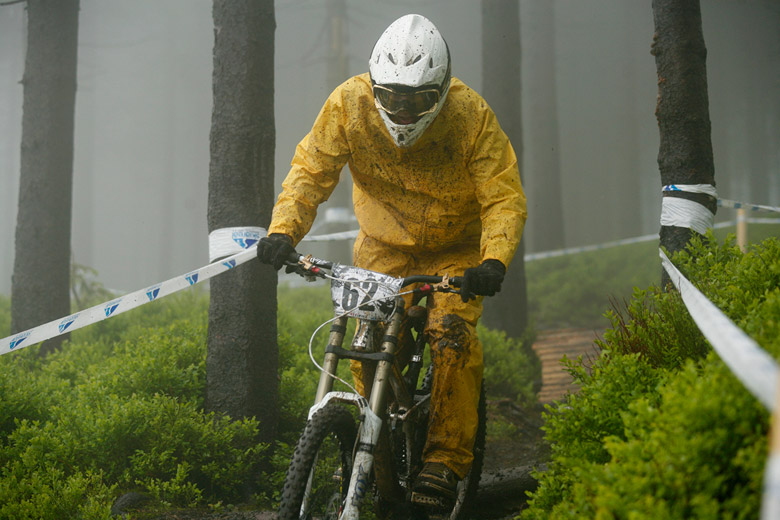 Neděle – Slopestyle, který se měl jet v sobotu, byl nejdřív z pochopitelných důvodů přesunut na neděli, ale ani to nakonec nebylo nic platné a celý závod musel být zrušen, i když třeba takový Netro na něj netrpělivě čekal celý víkend. Nakonec si ale spravil chuť, když kdesi ukořistil sjezdové kolo, které jeho poctivých sto kilo dokázalo bezpečně svézt dolů. Škoda jen, že Netrovi půjčené kolo nedovolilo změřit síli s ostaními sjezdaři. Další dirtař Žena se nakonec do sjezdového závodu pustil a skončil na parádním 43. místě.