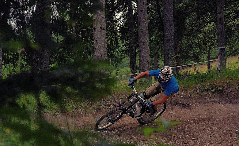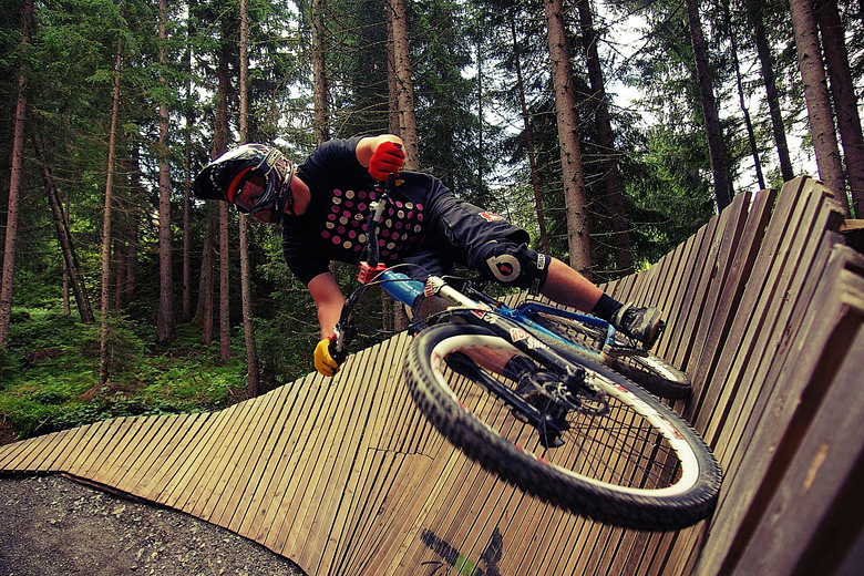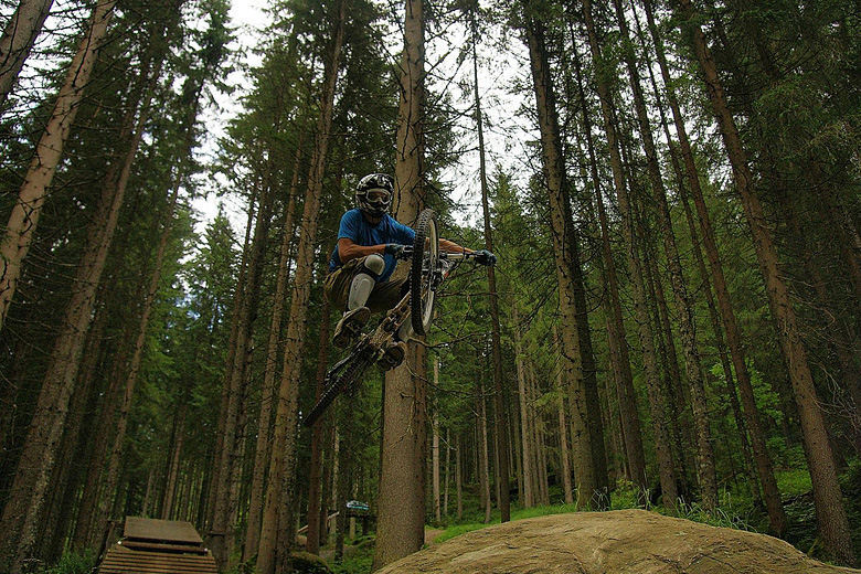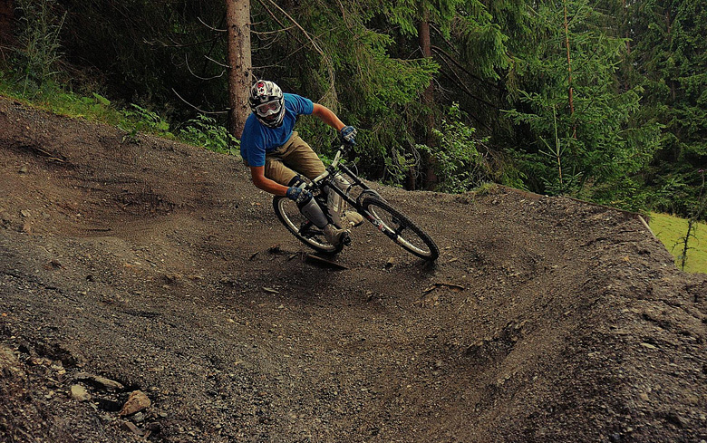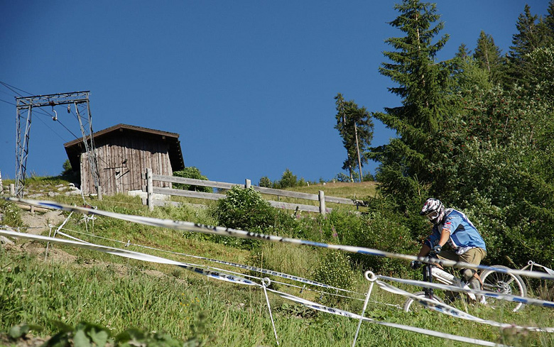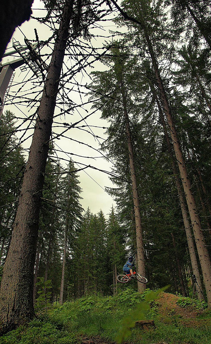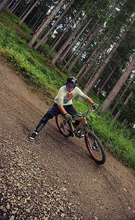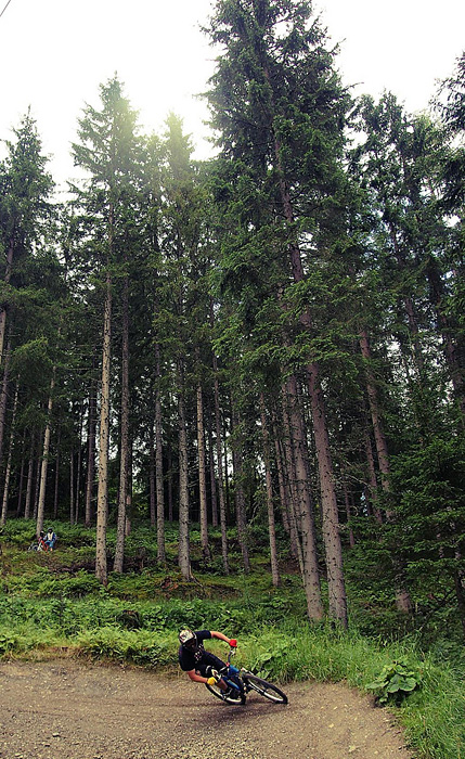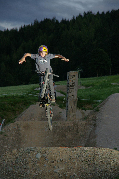 První společnej ride v Leogangu jsme si dali spolu a projeli nejlehčí trasu, kde se člověk v podstatě jen vezl, jen na jednom místě byla trochu víc utažená zatáčka s asi půl metru hlubokou, deštěm vymletou škarpou, která byla podél celý cesty. Ta se stala osudnou Lumčákovi, kterej se do ní smotal tak, že ho museli dva tahat ven. Lumčák tímto pádem poslal svoje koleno do věčných lovišť ( = na znojemskou ambulanci) a zbytek tripu strávil ve stanu.