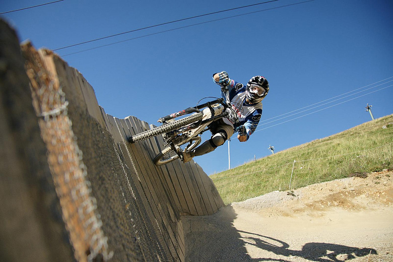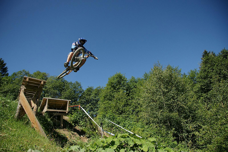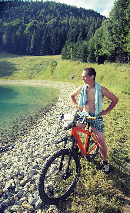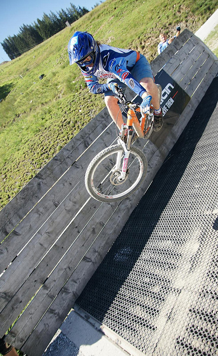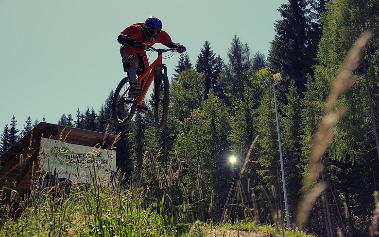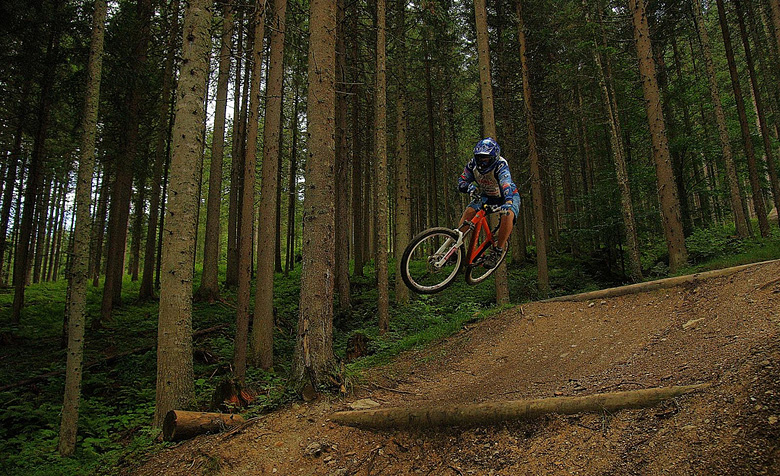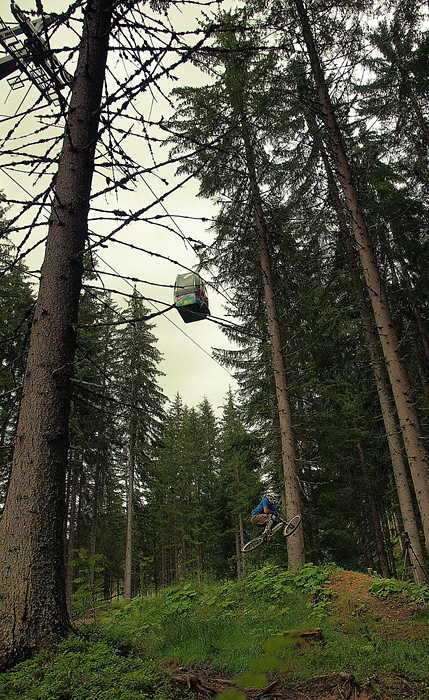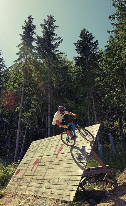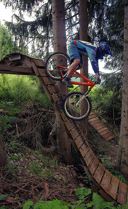 První společnej ride v Leogangu jsme si dali spolu a projeli nejlehčí trasu, kde se člověk v podstatě jen vezl, jen na jednom místě byla trochu víc utažená zatáčka s asi půl metru hlubokou, deštěm vymletou škarpou, která byla podél celý cesty. Ta se stala osudnou Lumčákovi, kterej se do ní smotal tak, že ho museli dva tahat ven. Lumčák tímto pádem poslal svoje koleno do věčných lovišť ( = na znojemskou ambulanci) a zbytek tripu strávil ve stanu.