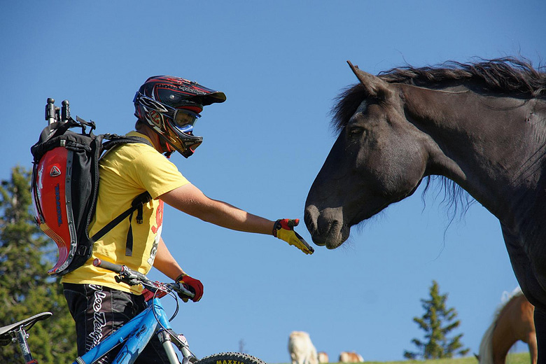 Nejdelší trasa, která vede z úplného vrchu Leogangu, měří něco málo přes 5km. Zatímco je první půlka více-méně klasika, od poloviny výš (s převýšením 420m) můžete zažít to, co asi nikde jinde. Kličkování mezi volně se pasoucím dobytkem, ukrutnej sjezd v lese, kde vám přes cestu skáčou koně nebo prospektem pojmenovaná „Panorama Tour“, na který jsem se málem zabil. Od poloviny níž (Mittelstation ve 1320m.n.m.) jsou to ukrutný klopenky, ďábelský převýšení, série skoků, dropů, fotogenických wallridů a podobně.