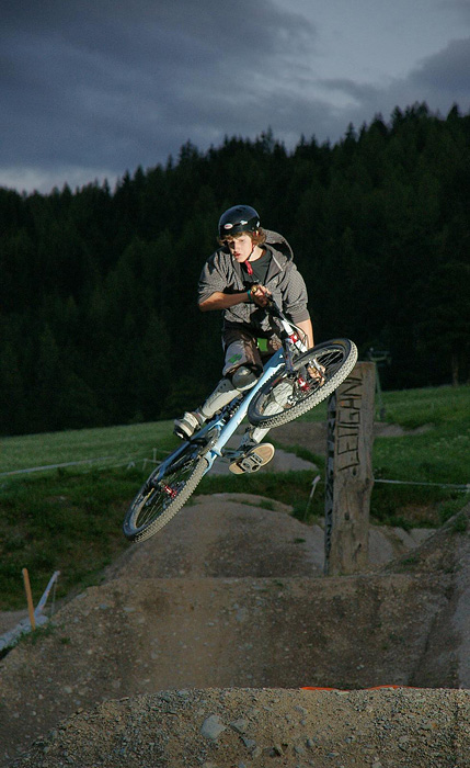 V Leogangu je taky asi nejlepší NS/Freeride trať z výše jmenovaných bikeparaků, lávky, kořeny, vychytávky, kompletní bahno. Tratě se sbíhají do notoricky známého dirt parku, kde nás po příjezdu překvapili dva kluci, Schääng (13) a Lukas (11), kteří na dirtech lítali největší lajnu…