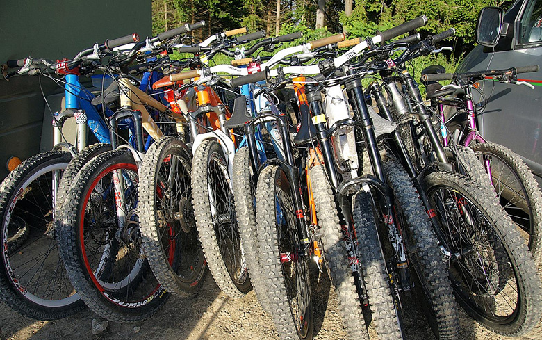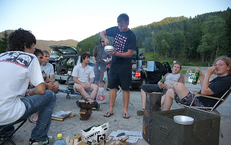 Semmering má tu výhodu, že je blízko. Za dvě hodiny se celá parta vysoukala z aut, začala stavět stany a montovat kola. Semmering je vcelku easy. Je to jeden z těch bikeparků, kam se dá zajet se starou a celou rodinou, půjčit si za ne zrovna zanedbatelnou částku z místního rent-a-bike Specialized fulla a drandit celej den. O to zákeřnější a bolestivější jsou pády, který jsou na místním šutrů-jak-nasráno dojezdu poměrně dost cítit.