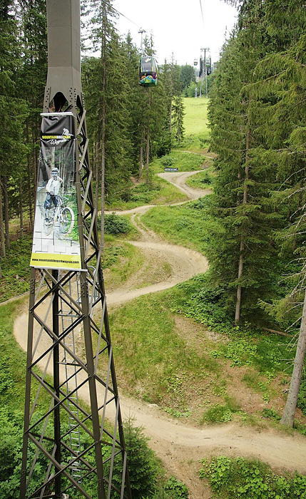 Leogang na druhou stranu nabízí za 31E na den ve srovnání s předchozími dvěma bikeparky nesrovnatelně víc. Celkem deset (10!) různých tratí lemovaných dráty pod napětím kvůli dobytku, na jejichž zdolání už člověk musí mít určitý skillz.