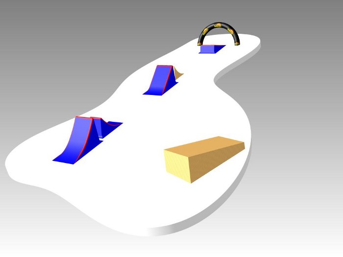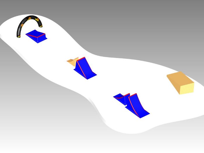 Pojďme se podívat na samotnou trať. Jelikož je trať situovaná do mírného svahu, bude průjezd velice plynulý a nebude zapotřebí mnoho šlapání. Startovat se bude v horní části pod obloukem Big shock. Po odstartování závodníka čeká 1,5 metru vysoký drop, dále bude pokračovat na 2 metry vysoký dřevěný odraz s dopadem ve vzdálenosti cca 6 metrů, pokračuje po mírném svahu na poslední skok a sice 2,5 metru vysoký odraz ze sněhu s dopad cca 5 metrů daleko. Skok bude mít hodně vysoký dopad a proto bude bezpečný a zároveň hodně pohodlný pro těžší triky. V jednání je motokrosová rampa od Gaspiho, takže je možné, že na druhém dvojáku bude FMX odpal vysoký 2,5 metru. Za posledním dopadem bude pro zpomalení závodníka a bezpečné zastavení klopenka. Odrazy a průjezdy mezi skoky budou potaženy kobercem, proti vytváření kolejí. Skoky jsou stavěny z umělého sněhu. Vedle skoků bude postavený ledový bar a stage pro kapely. Všichni závodníci mají k dispozici vlek, který je vytáhne do úrovně startu.