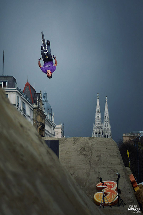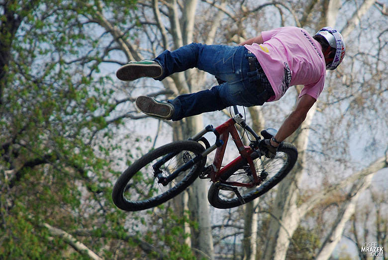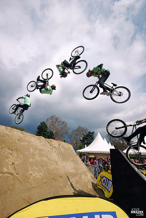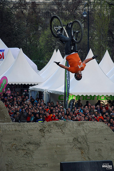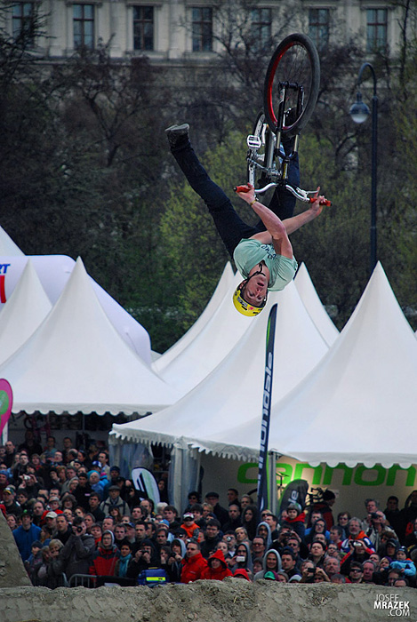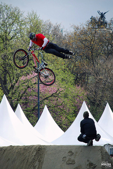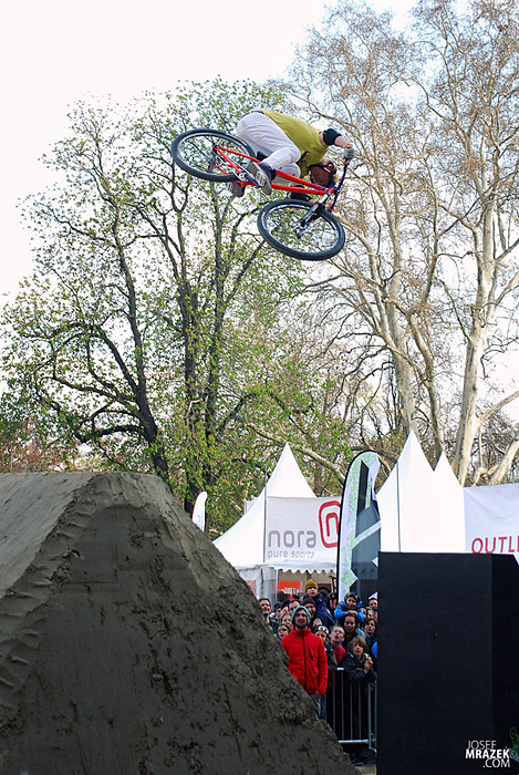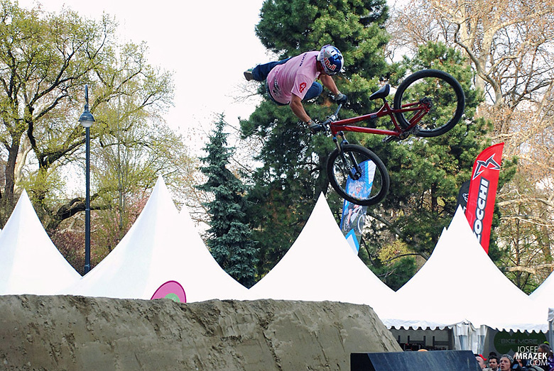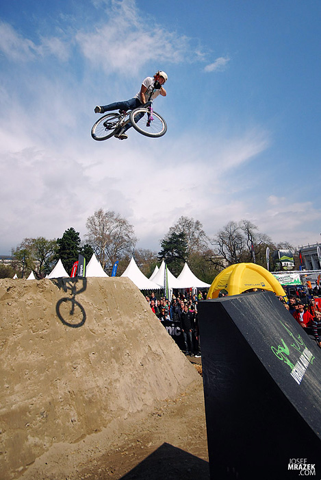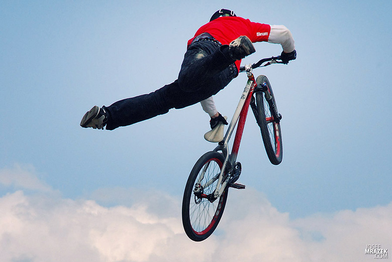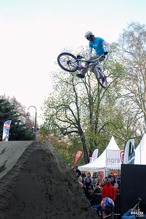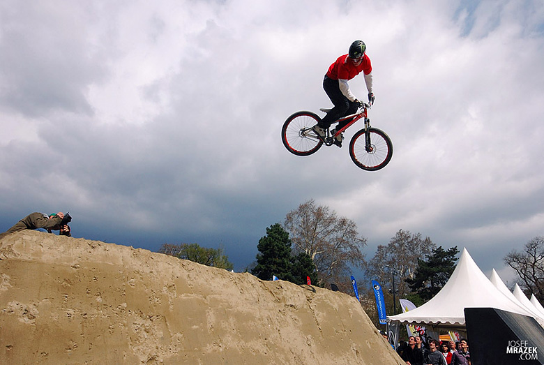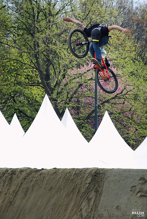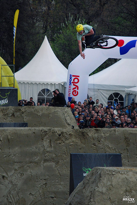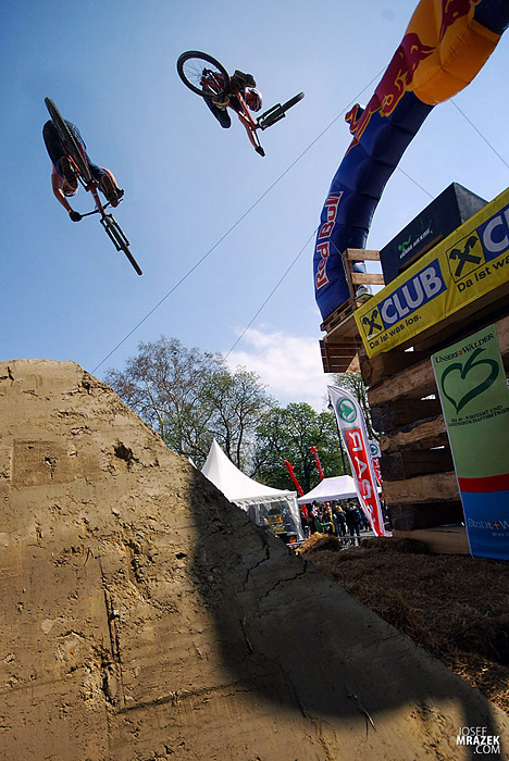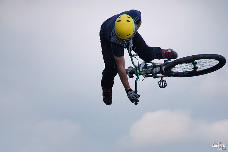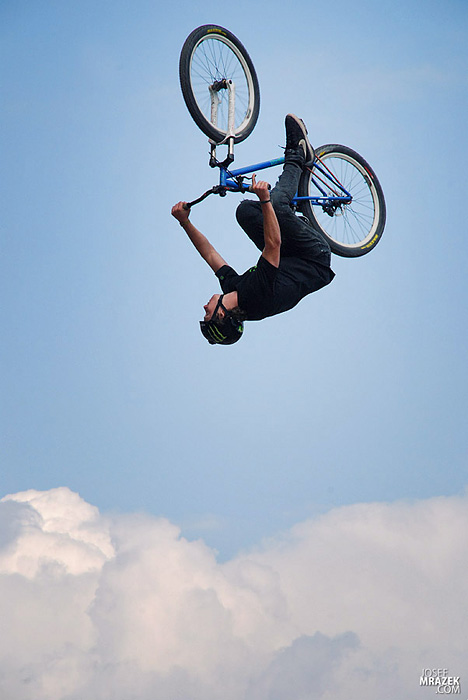 Začneme klasicky fotkami českých bikerů. V konečném hodnocení se nejlépe z Čechů (a potažmo i Poláků) umístil Tomáš „Leader“ Zejda. Na fotce vlevo s úsměvem čeká na hodnocení svojí první finálové jízdy. Vpravo je pak protáhnutý tailwhip, na který se vyptával i Darren Berrecloth…