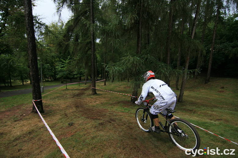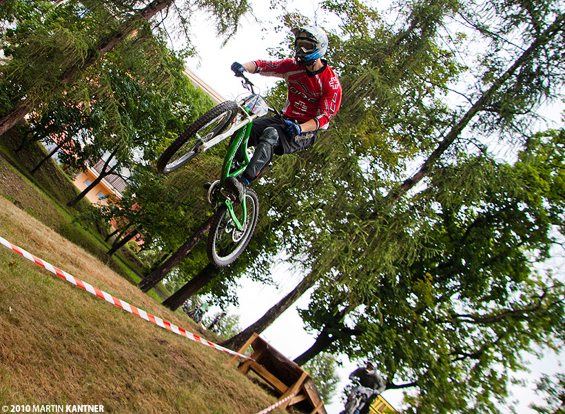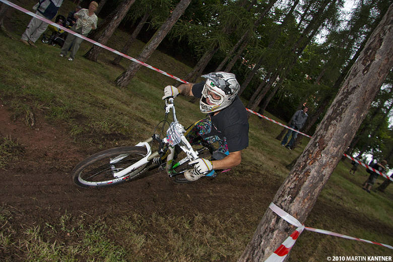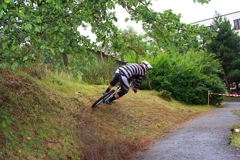 Na závod se k nám ale počasí neotočilo zády a krom lesní pasáže se obě dvě závodní jízdy jely na suchém povrchu. I pro letošní DT jsem si připravil tradičně můj dámský speciál, tedy Syrénu a silniční pláště. V první jízdě jsem nasadil strategii, pojedu v klidu a hlavně nepadat. Jak jsem plánoval, tak činím. Během jízdy jsem udělal sice několik drobných chyb, ale při průjezdu cílovou bránou jsem byl s jízdou relativně spokojený. S velkým napětím čekám na průběžné výsledky prvního kola. Když mi po chvilce napětí Brozák říká, že jsem na 11. fleku, jsem dost v rozpacích. Přece jsem tak špatně nejel, si říkám? Jdu k autu, čistím kolo, ladím přehazovačku a říkám si, tak takhle by to nešlo. Při tlačce na druhou jízdu koukám na trať a říkám si, jak by to šlo projet rychleji. Na druhou jízdu jsem se po dlouhé době docela vyhecoval a s nasranou grimasou pod helmou jsem vyrazil ze startu. Opět jsem se nevyvaroval chybám, jako špatné zařazení a vyjetí z optimální stopy, ale cílový čas 1:33:321 mi nakonec vynesl ve fullech druhé místo a za to jsem byl moc rád! První flek bezchybně zalítnul Daniel „Danny“ Marek a po konečném vyhodnocení výsledku bral třetí místo Martin „Babušák“ Čermák. Výsledky ostatních kategorií najdete na http://www.sport-base.cz/v10.html