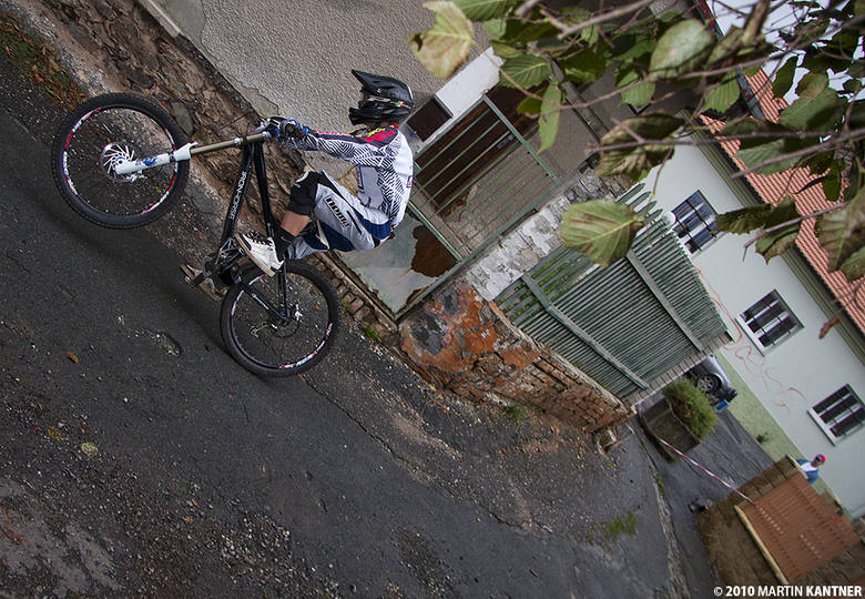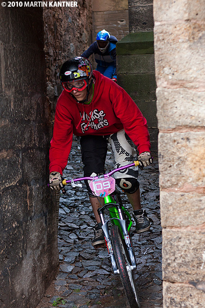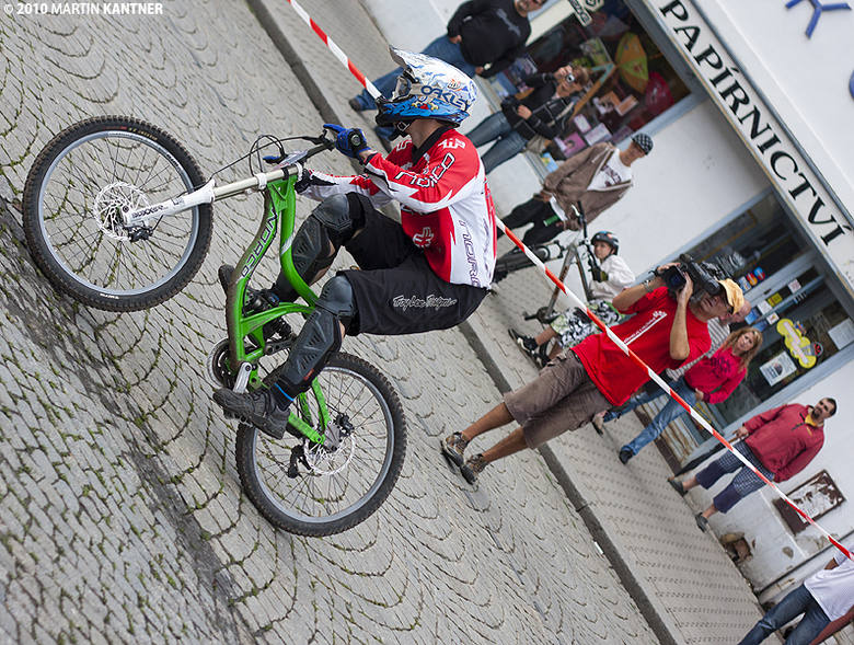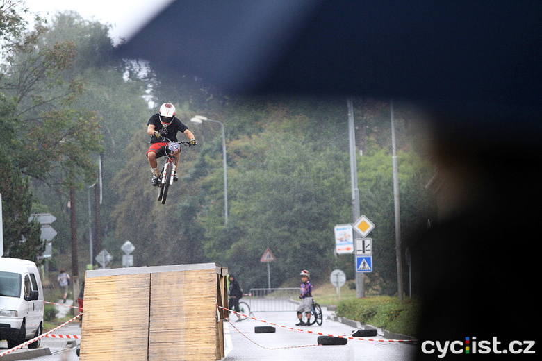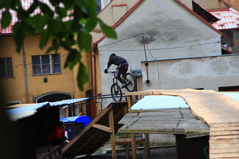 Ráno se probudím a žádná změna, mokré žulové kostky budou klouzat i v sobotu. Pro každého je trať ale stejná. Oblíkám se, beru kolo a po registraci dávám první tlačku na start. Jdu podél trati a všechny změny, které se na trati objevily, jsou oproti minulému ročníku zábavnější. Po startu nás čekala první hamtačka na dřevěný odpal do svahu, který měl blízký, nebo vzdálenější dopad. První jízdu volím zlatou střední cestu, takže výsledek je rána jako prase. Myslím si, že tento skok mnoho lidí bavil, stejně tak jako mě. Následoval průjezd lesní pasáže, výjezd na panelovou cestu a šup mezi paneláky. Před Vysokou bránou nás čekala dřevěná lavice a následný průjezd samotné brány bych nazval „uličkou smrti“. Po výjezdu jsme přejeli Favorita, mírně prokličkovali mezi květináči a hurá na tržiště. Pro mě největší překvapení, udělat závodní koridor stylem hodit na eternitové stříšky OSB desku, by mě opravdu nenapadl. Po přejetí všech stánků nás čekalo poslední zakousnutí do pedálu a po odrazu na konci průchodu už jsme v prostoru cíle. Ten je ale značně vyosený a trefit se do cílové brány je tak časově náročné, že zde vznikají i kreace typu „seskočit ze 2 metrové konstrukce na placku na žulové kostky“.