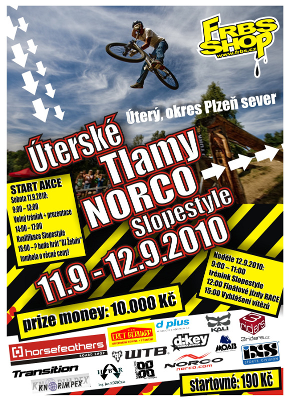 Další infošky očekávejte na našem webu FRBS.CZ, nebo na Facebooku Úterské Tlamy Norco slopestyle 11.9. – 12.9.2010 , kdo bude mít nějaký osobní dotaz, tak mě může kontaktovat na tel: 603927907, nebo na tachmud2005@volny.cz