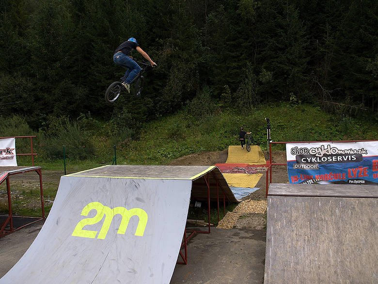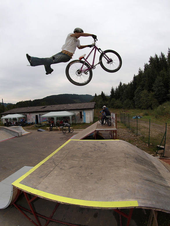To sa podarilo až Martinovi Madigárovi, ktorý už dáva svoj fliar na istotu. Takisto vracal cez celý funbox štýlovu 360, točenú priam ako 180 to 180 out. Backflip, nofoot to nofoot cancan, 360 tabletop, či condor zo stola mu vynieslu zaslúžené tretie miesto. Karta šla neskutočne Dominikovi Jancekovi (2m), který lietal v neskutočnej výške na funboxe, snáď najvyššie zo všetkých. Jeho pretiahnutý superman seatgrab, condor, či dacie triky dával vo výške a štýle. Snažil sa vrátit načisto aj doubletailwhip v rádiuse, 540, či vysnívaný trik Barspin to Condor. Bral teda druhé miesto. Na prvom mieste sa umístnil Prešovčan Tomáš Jeleň. Jeho jazdenie je ešte o kus daľek oproti predošlým. Backflip ponad Jamatona, Backflip condor, frontflip, tailwhipy všade a na všetkom, aj z manuálu sú toho dôkazom. Jeleň sa žiaľ zranil pri poslednom flipwhipe a zobrala ho sanitka. No ajtak vyhral 50€ od Bikemagazinu a nakoniec aj** Best Crash.** V súčastnosti má nohu v sádre, dúfame, že sa čoskoro uzdraví.
