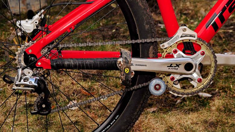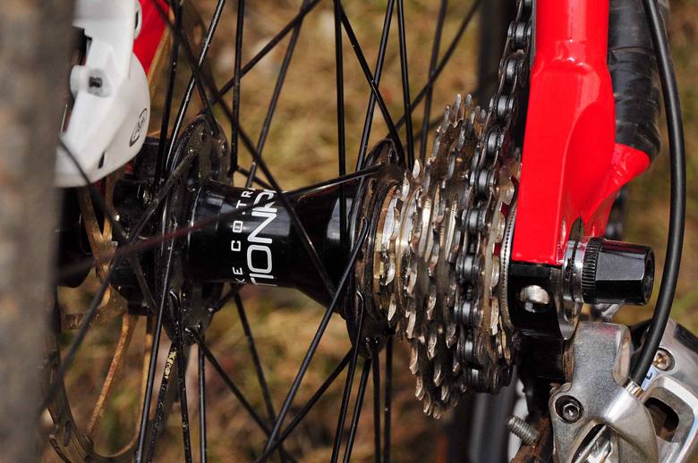 Pohon: o maximální odpich od startu se krom mých nohou stará lehounký převodník Renthal SR4 s 38 zuby. Zpřeházené převody u kazety jsou již na 4X kole samozřejmostí. Já používám 8 rychlostní siliční kazetu – oproti 9tkám je levnější a z celé kazety používám 3 – 4 převody. O napínání řetězu se stará karbonový napínák Shaman Racing – Drake.