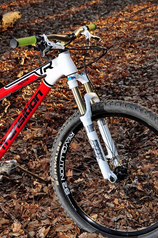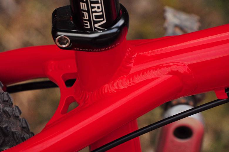 Rám: na rámu Transition Bank je hned několik věcí, které zvyšují tuhost. Mezi 2 nejhlavnější patří konický sloupek hlavového složení, spodní miska s průměrem 1,5" a horní s „klasickým“ rozměrem 1 1/8". Na kole je redukční hlávko Cane Creek pro použití vidlice bez konického sloupku. Další vychytávkou na rámu je možnost použití kol jak s klasickým rychloupínákem tak i s 10mm pevnou osou. Já vozím zapletená kola Transition Revolution 28, které používají pevnou osu 10×135mm a spolu s rámem tvoří tuhý komplet, co vystřeluje ze zatáček v parádní palbě.
