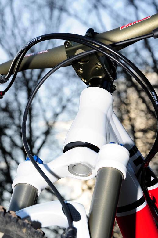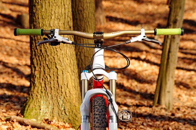 Troniq: Díky za pochvalu, řídítka jsem zvolil nízká jednak, protože jsem na to dost ulítlej, a taky kvůli vidlici, která není přímo 100mm ale má něco vyšší zdvih. Kokpit je tím pádem výš, než bych chtěl. Když pak jedu ze startovní rampy, tak se kolo hodně zvedá na zadní a je celkově neklidný. Proto tento malý zdvih řidítek a vše funguje parádně.