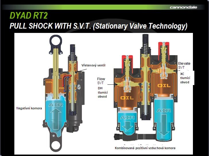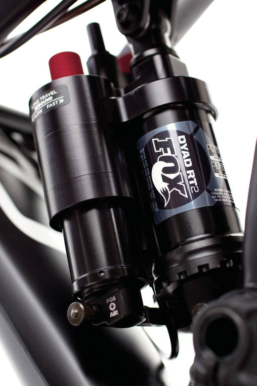 Srdcem kola je inverzní tlumič Fox DYAD RT2. Jak je vidět na obrázku, má dvě pozitivní a jednu negativní komoru. Pozitivky mají každá svou regulaci tlumení, ale foukají se společně. Důležitým je vřetenovitý ventil, který obě hlavní komory spojuje a rozděluje – dva režimy ELEVATE a FLOW. Tah lanka z páčky na řidítkách buďto otevře velký okruh – 150 mm na déhá, nebo přivře a tlumič funguje pouze na 90 mm. Změna zdvihu ovlivňuje i geometrii, a tak při ELEVATE modu má kolo o centimetr výše střed a o jeden stupeň příkřejší hlavu. Inverzní tlumič se fouká na vysoké tlaky, a tak se Jekyll dodává i se speciální tlumičovou pumpou. Standardní pumpa na tlumič Fox DYAD RT2 nestačí.