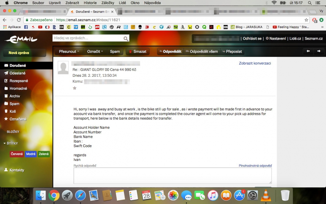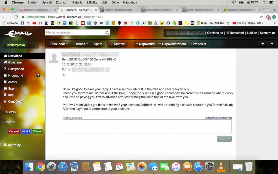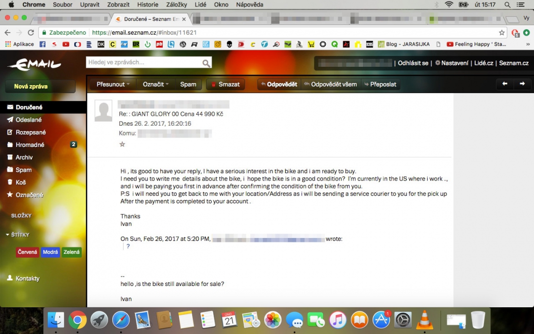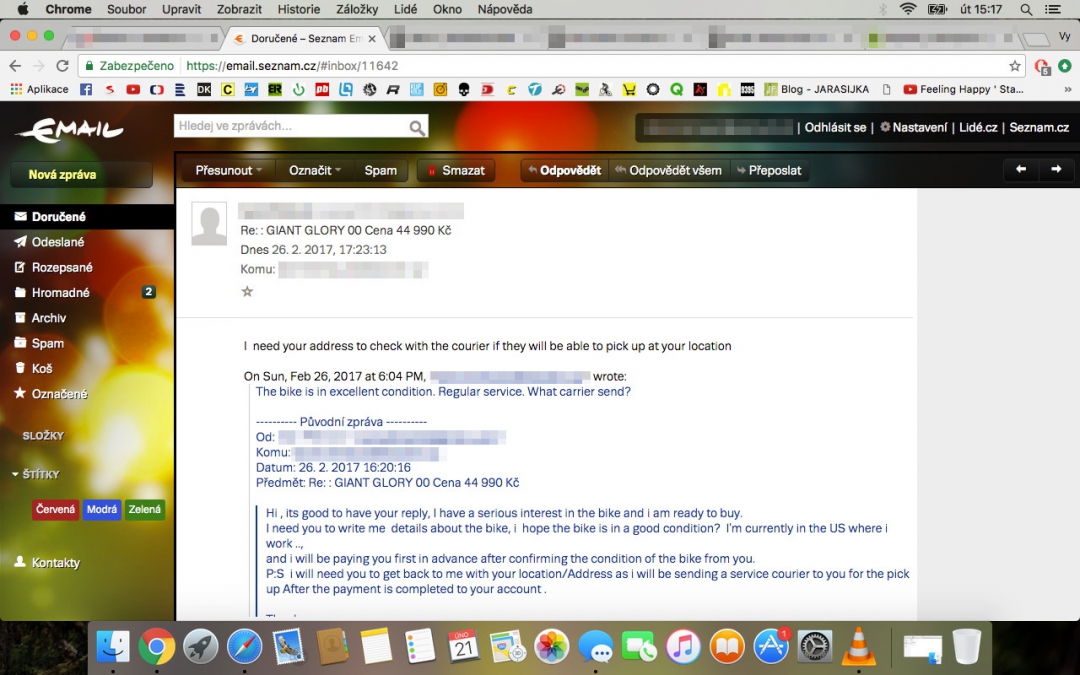 To, že právě tvoje kolo našel někdo ze zahraničí na českém bazaru je podivné, ale jednání s kupce je více než solidní, tak proč ne. Náhody se dějí a Google se svým vyhledáváním je mocný pomocník. Proběhne další komunikace a vše je na dobré cestě k oboustranně výhodnému obchodu.
