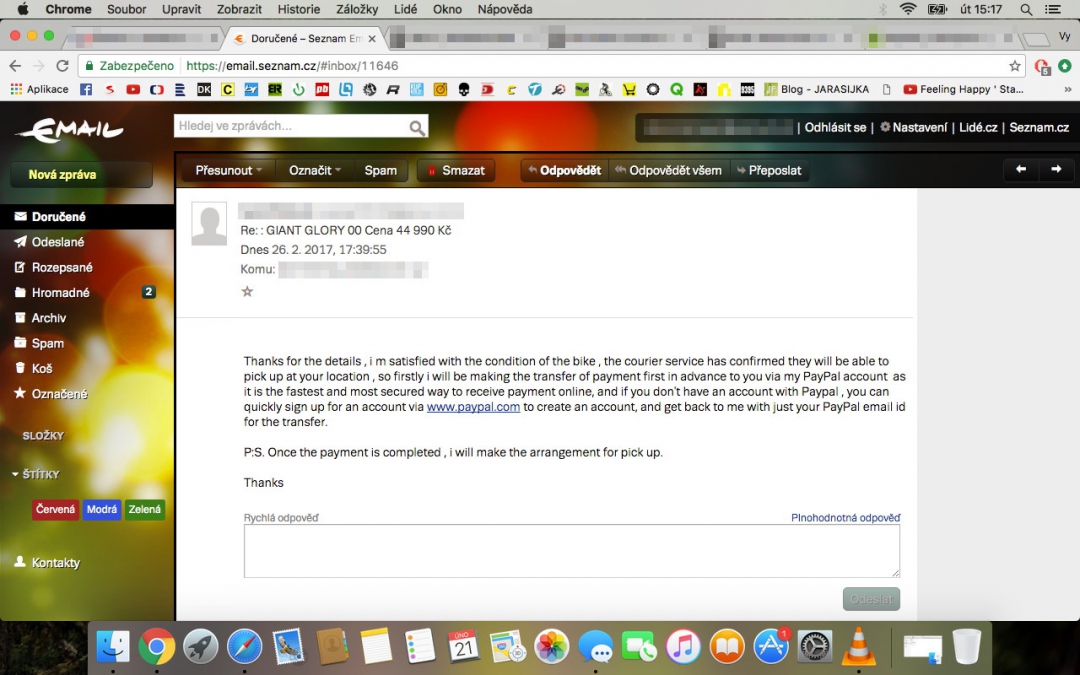 Jaká je její konečná cena v USD nebo EUR? Pokud je to možné, můžete mi poslat aktuální foto kola?". Třetí jeho mail už psal normálně anglicky (přeloženo do CZ) "Jsem spokojen s podmínkami a cenou a chci platit platby PayPal + 3,9% přímo z mého účtu. Takže byste mi měli zaslat svou e-mailovou adresu pro paypal, pokud máte již účet, což je e-mailová adresa, kterou jste použili při registraci, nebo mi můžete poslat žádost o platbu Paypal, abych mohl pokračovat v převodu. Jakmile dokončím převod, budu kontaktovat mého přepravce a zařídit vyzvednutí, aby mohli kolo převzít poté, co jste dostal své peníze na účet. Potřebuji vaši adresu bydliště a číslo mobilního telefonu, aby bylo zajištěno vyzvednutí.