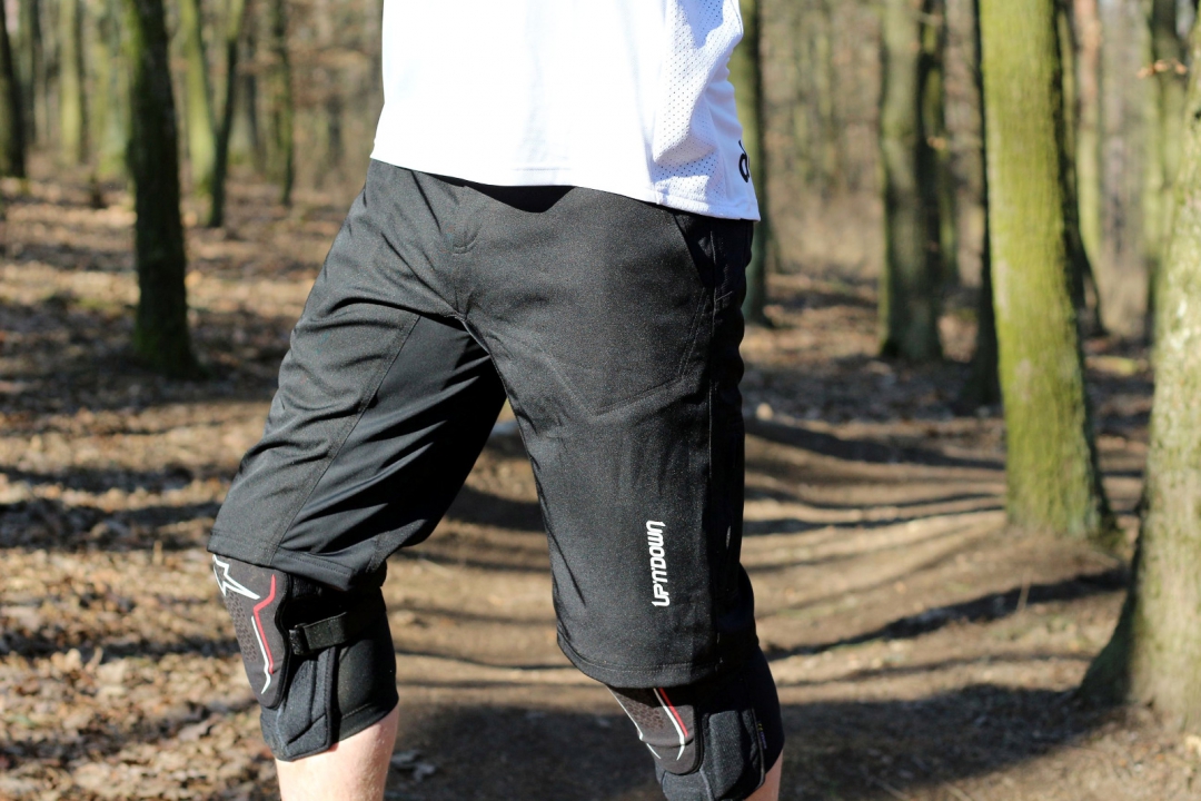 mi kraťasy překrývají velkou část kolenního chrániče. Při jízdě to