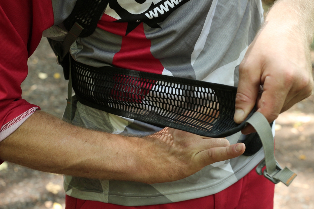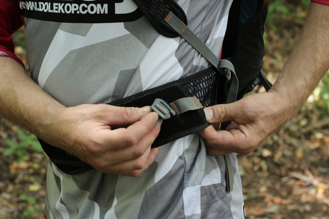 Bederní pás se dá dobře stáhnout a přesto zůstává pružný, jeho drobné natažení umožní dva pružné panely u našití k tělu batohu, velmi praktické. Míň praktické je už dvojité zapínání, suchý zip je OK, ale na použití jistícího háčku si musíš zvyknout. Mě to trvalo… dlouho, jen po hmatu jsem to doteď nezvládl. Klasická spona by byla lepší.