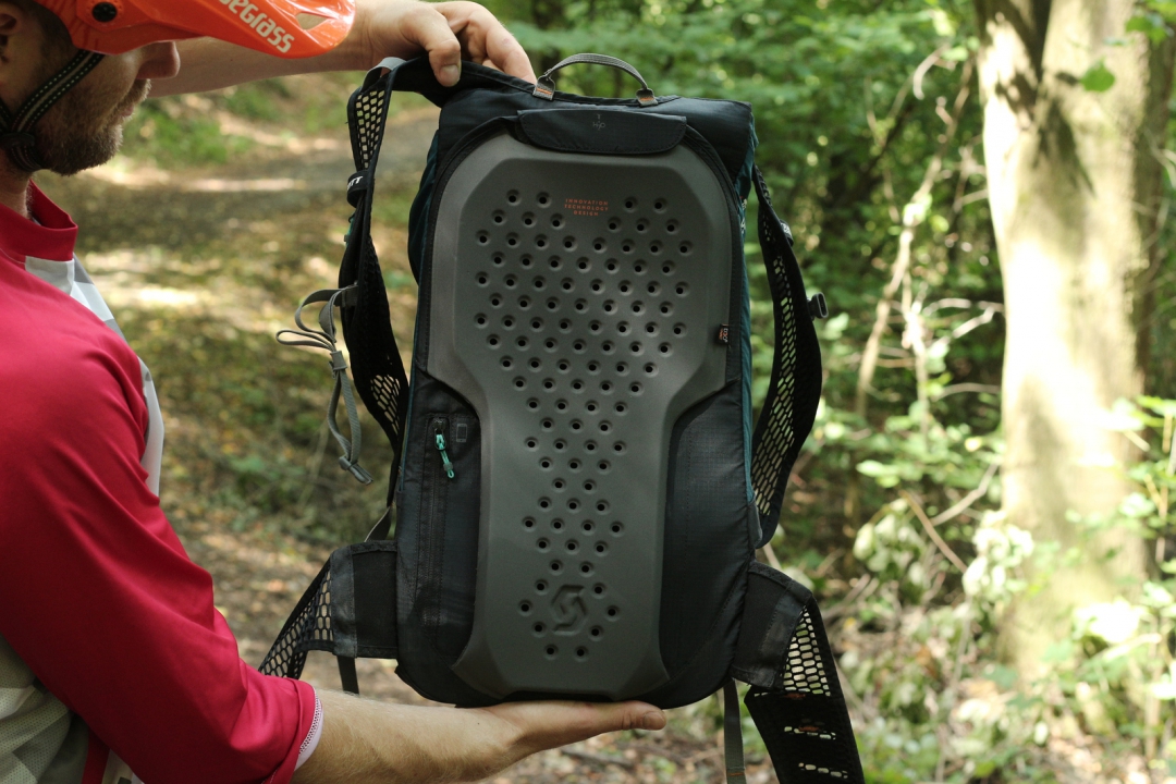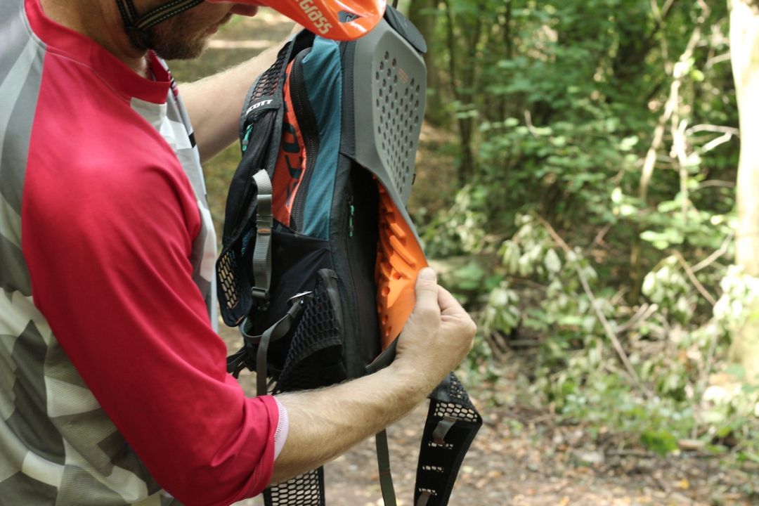 Páteřák, páteřák, páteřák… jaký je? U SCOTT Trail Protect Evo FR 20 je jiný než u jiných výrobců batohů. Chránič páteře se stal pevnou součástí celého batohu, nelze jej vyjmout. Ostatní výrobci na to jdou po většinou jinak, do kapsy v batohu se vkládá tlumící ochranná vložka. To je výhodné, když chceš jet s lehčím batohem pro rohlíky, chránič vyjmeš a jedeš. Reálně, dělá to tak někdo? Já osobně ne, asi lenost, věřím, že to má takhle nastaveno i většina lidí. U Scottu si to myslí také a proto je zde páteřák našit napevno. Jeho materiál je chytrá pěna D3o, splňuje certifikaci EN 1621–2 a je hodně perforovaný a prodyšný.