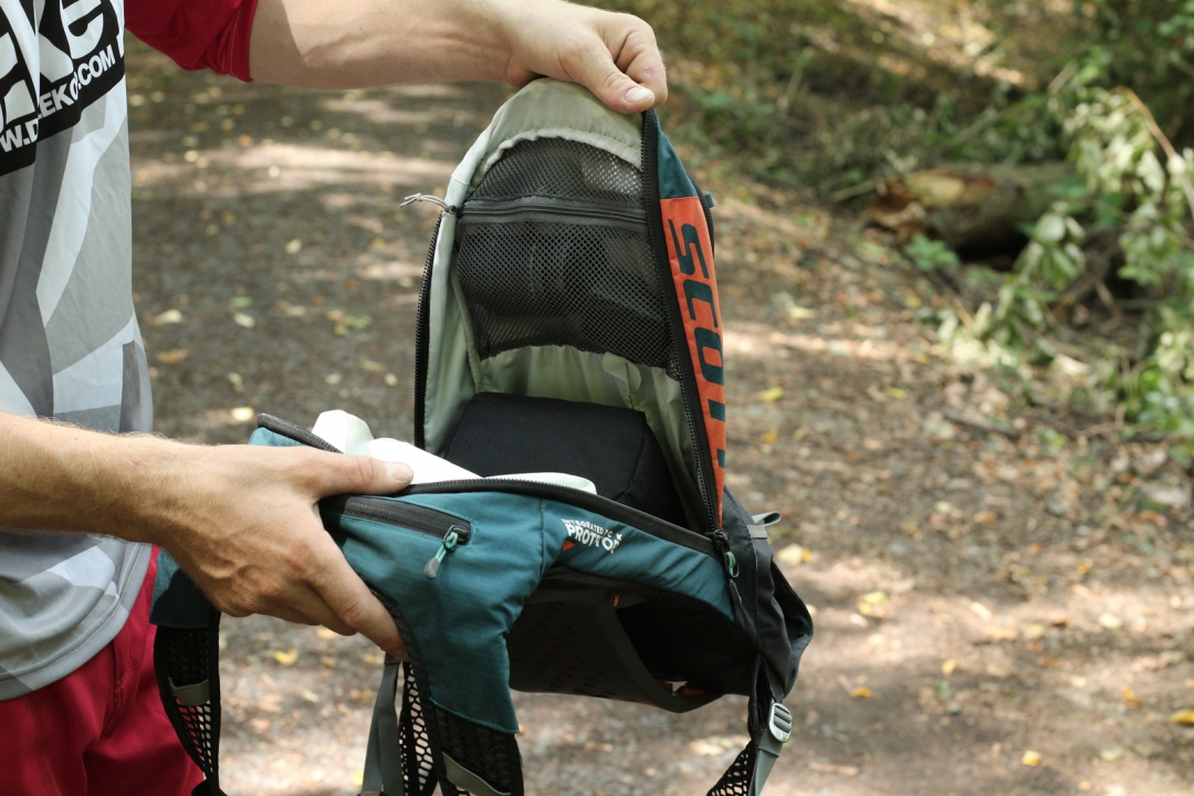 Kam dát mobil tak, aby byl i v případě pádu v bezpečí? Na to ve Scottu mysleli a kapsa na mobil nechybí, ale její umístění je nezvyklé. Přistupuje se k ní ze strany zad batohu, umístění na první pohled nepříliš praktické, ale zdání klame. Vytáhnout mobil bez sundání batohu lze, ale jde to ztuha, musíš dát ruku šikovně za záda, otevřít zip a mobil může ven. Zato ochrana při případném pádu – největší. Mobil máš v oblasti bederní páteře, z jedné strany ho chrání tělo a páteřák, z druhé pak celý batoh. Když prší a máš nasazenou pláštěnku, mobil si vytáhneš i bez jejího sundání. Pecka.
