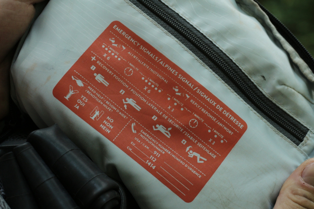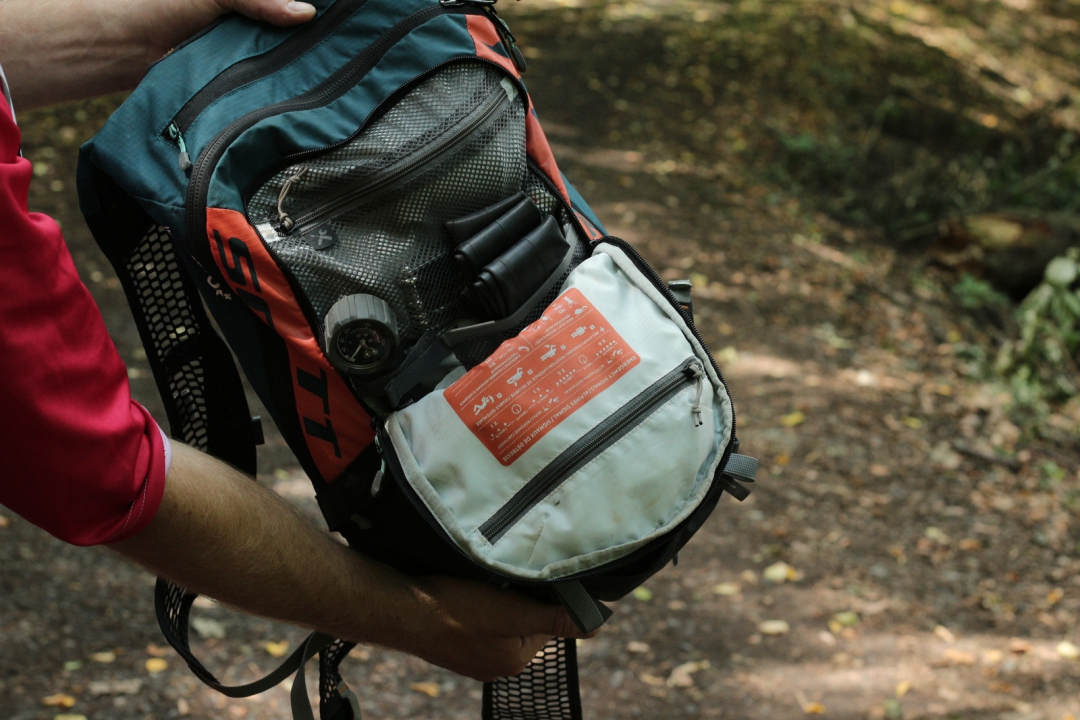 Batoh má jednu větší a jednu menší komoru, velká komora nemá žádné další dělení jen jednu síťovanou kapsu na zip. Menší, přední komora obsahuje více kapsiček, na vercajk, na pumpu… a také zde najdeš tabulku jak volat o pomoc a jak dát zraněného do stabilizované polohy, praktické, třeba to nikdy nebudeš potřebovat, ale mít to po ruce se hodí. Z horní strany batohu najdeme ještě jednu větší kapsu optimálně na brýle, ale bez jakékoliv vnitřní výstelky, takže brýle raději v obalu. A na závěr, po obou bocích jsou menší pružné kapsy, jedna překrytá légou jištěnou suchým zipem a druhá otevřená.
