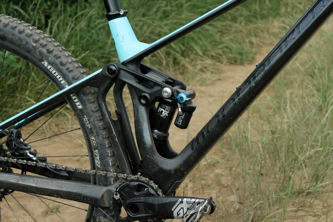 Když jsem koukal do papírů k tomuhle stroji, nenašel jsem nic, co by mě vyloženě nadchlo, nebo naopak odradilo. Geometricky samozřejmě sdílí DNA Mondrakeru,i když je cítit určitě umírnění. Reach je v Mku už „jenom“ 470mm, zadní stavba je příjemných 435mm, sedlový úhel je 75° a hlavový už takřka „tradičních“ 66°. Rozvor je pak 1210mm, bb drop 21mm. Je chvályhodné, že i vzhledem nízkému středu a velkým kolům se u Foxy podařilo udržet poměrně nízký Stack 614mm (tj. nízká pozice řídítek vůči středu). Tohle všechno je na 150mm vzadu se 160mm vidlicí vepředu.