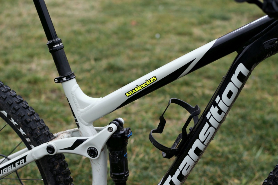 bicykla s nálepkou Transition ktorá mu dodáva nezameniteľný