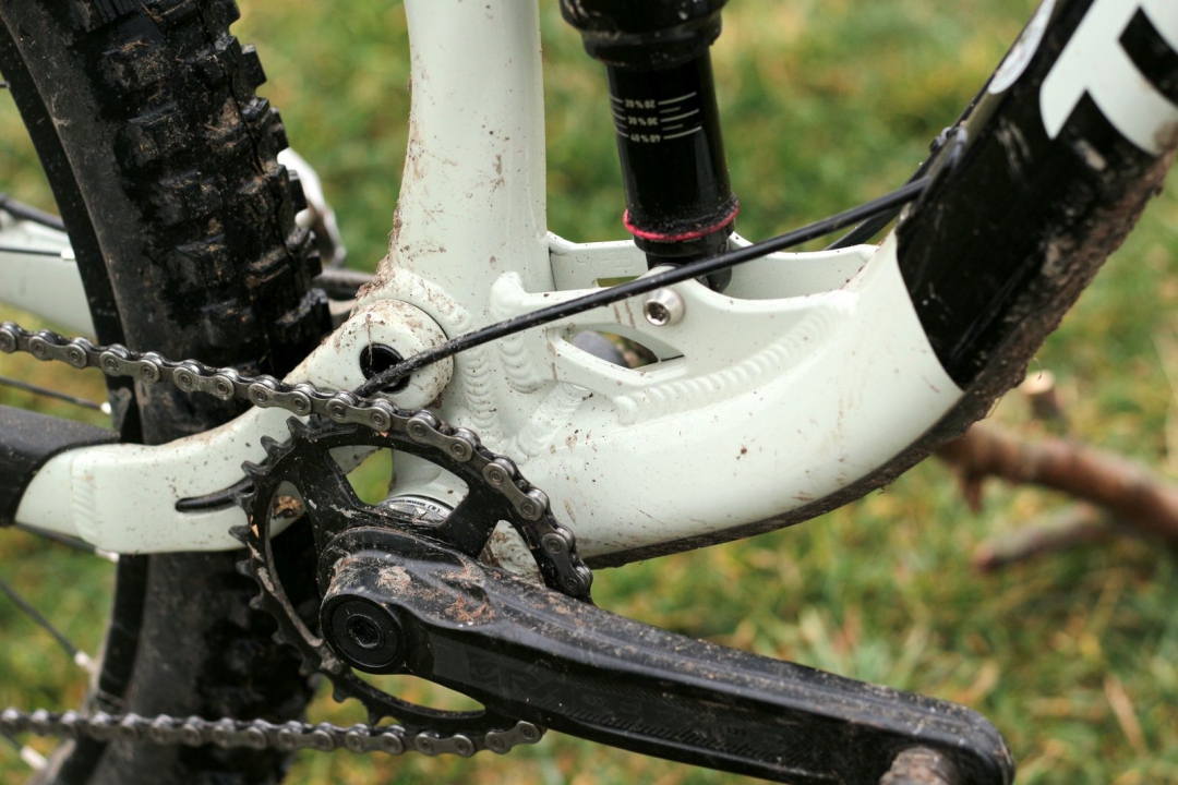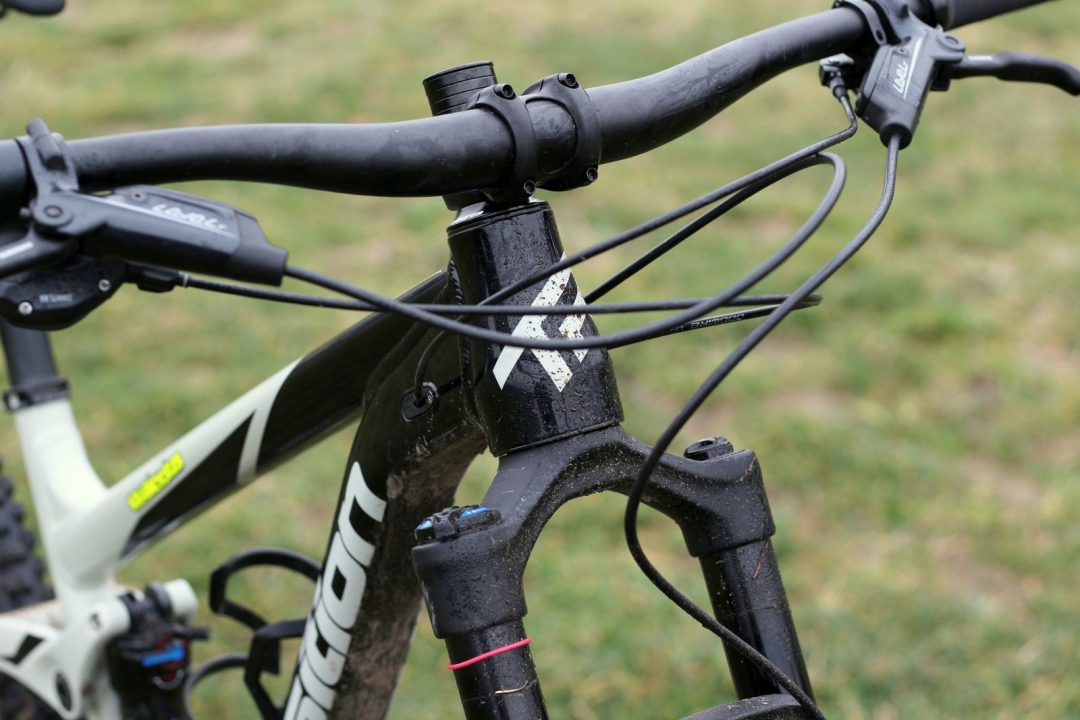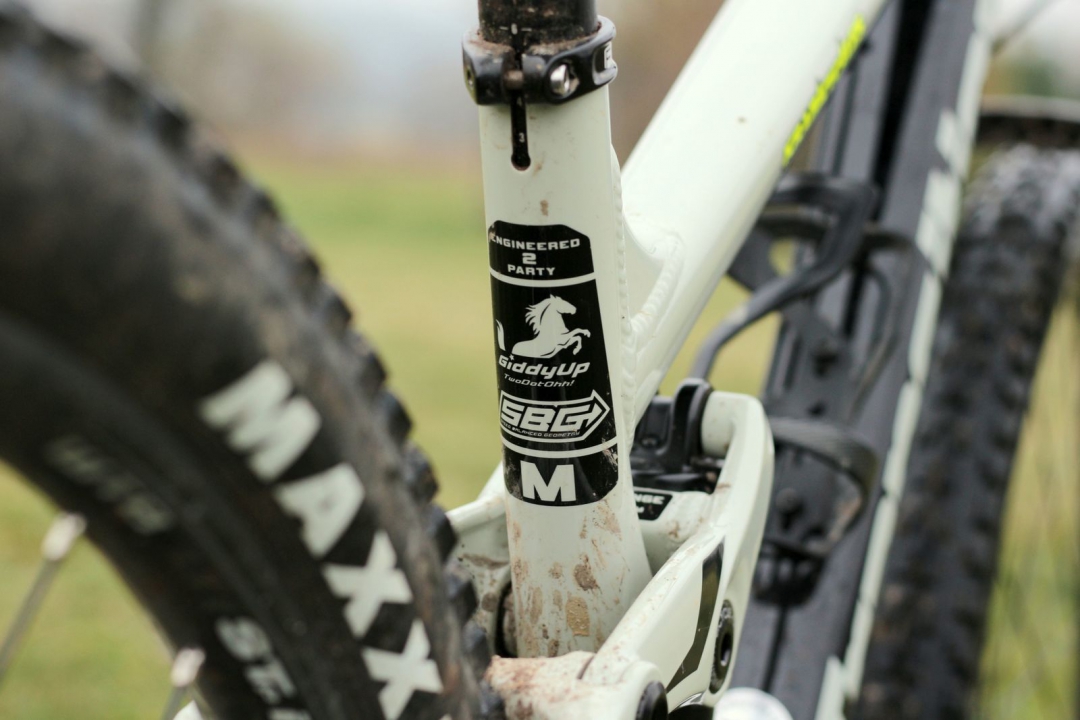 Hlavový úhel 66°, reach 450mm v M, zadní stavba 430mm, 35mm bb drop, stack 615mm. Rád bych se vyhnul slovu univerzální… ale jo, tohle je podle mě (a spousty lidí, co holdují hlavně ježdění z kopce) takový ideální střed. Kolo není ani moc dlouhé, ani krátké, úhly nejsou ani moc položené, ani moc postavené. Prostě akorát, pokud pro vás akorát znamená rychle a zábavně z kopce.