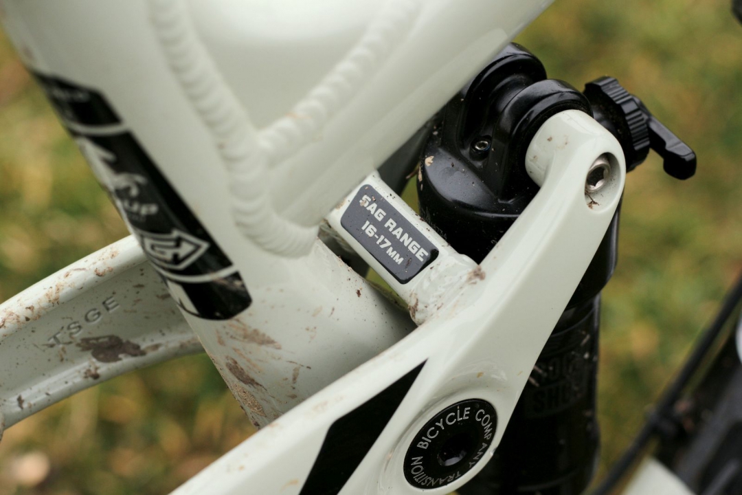 D1 jela překvapivě dobře. Vyskakuju z auta, tahám Tráňo z kufru, montuju pedály. Nastavení posedu – představec narazit na hlavové složení, brzdové páky do rovna. Nastavení podvozku – 1,8 do pneumatik (snad to duše vydrží), napráskat tabulkový tlak do Revelationu vepředu a když se ohýbám k tlumiči… HA! Dobře kluci Wošingtonští… Přímo na horní kyvce u tlumiče je nalakovaný doporučený základní SAG v milimetrech, v tomto případě 16–17mm. Foukám, měřím, sedám, dobrý, zamykám auto, zamykám tlumák, jedu na kopec.