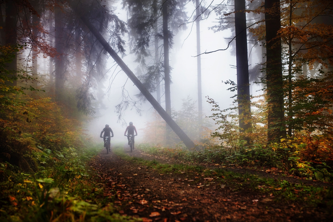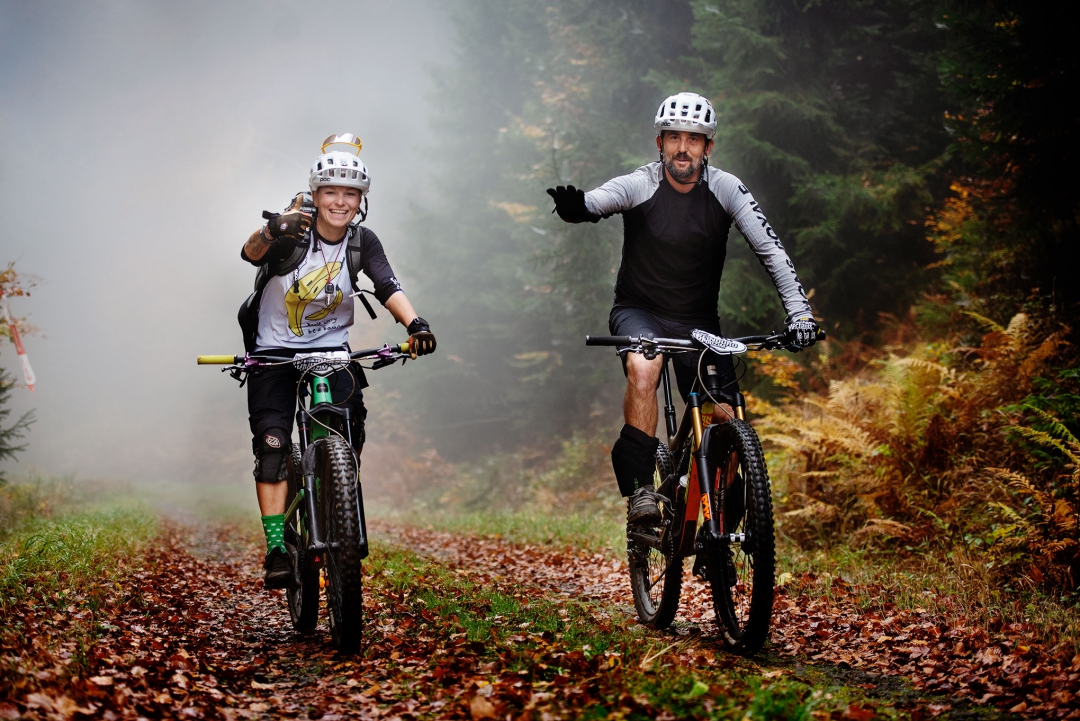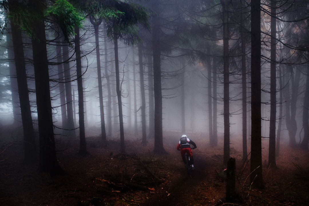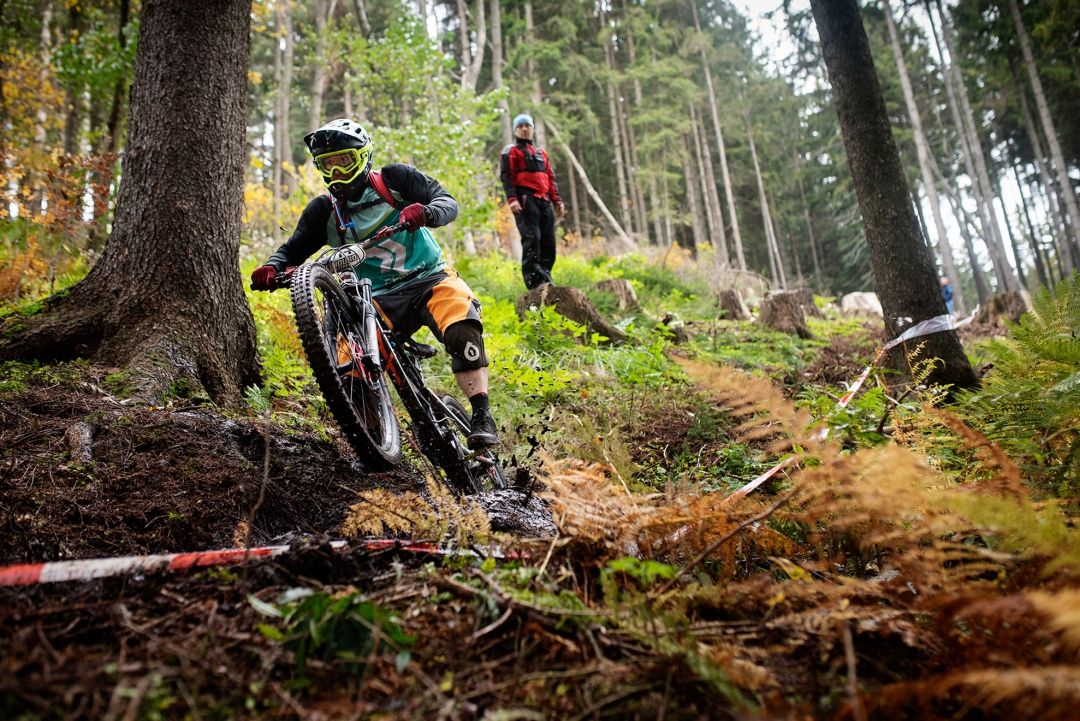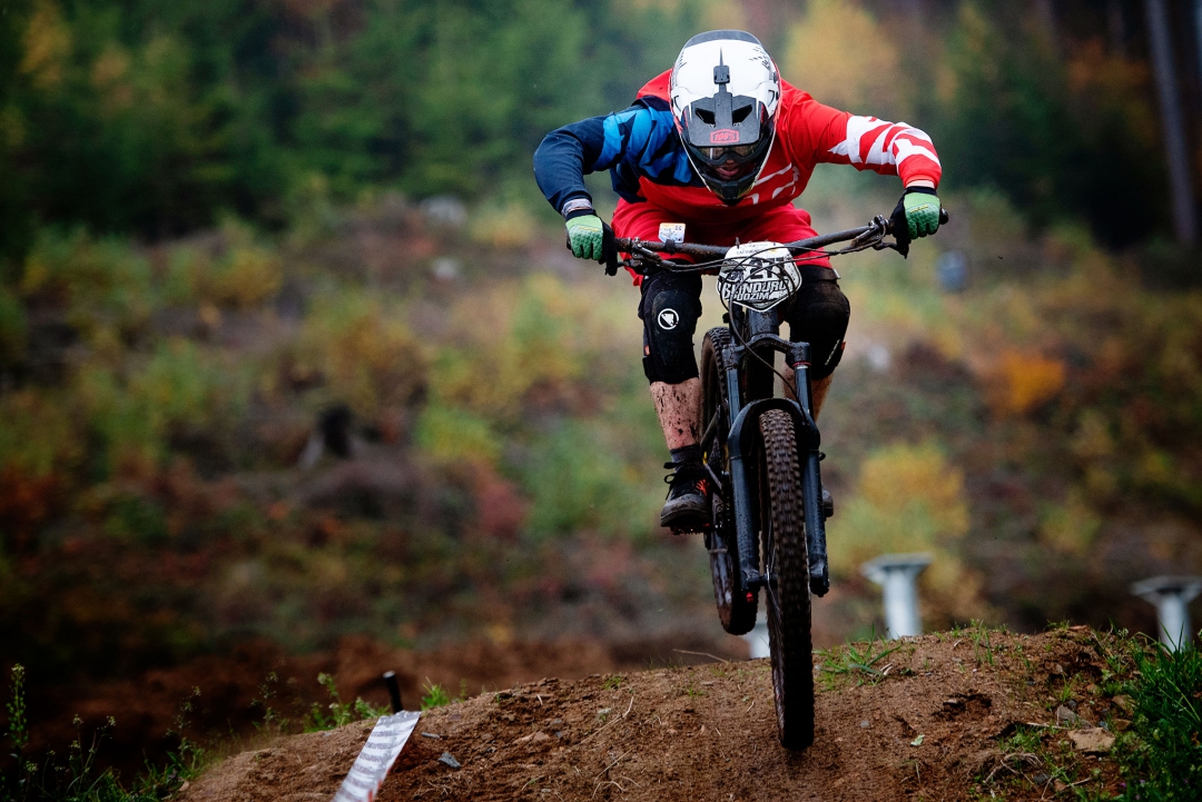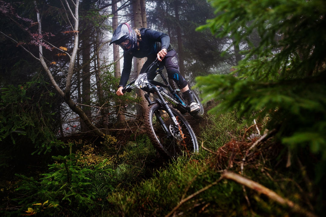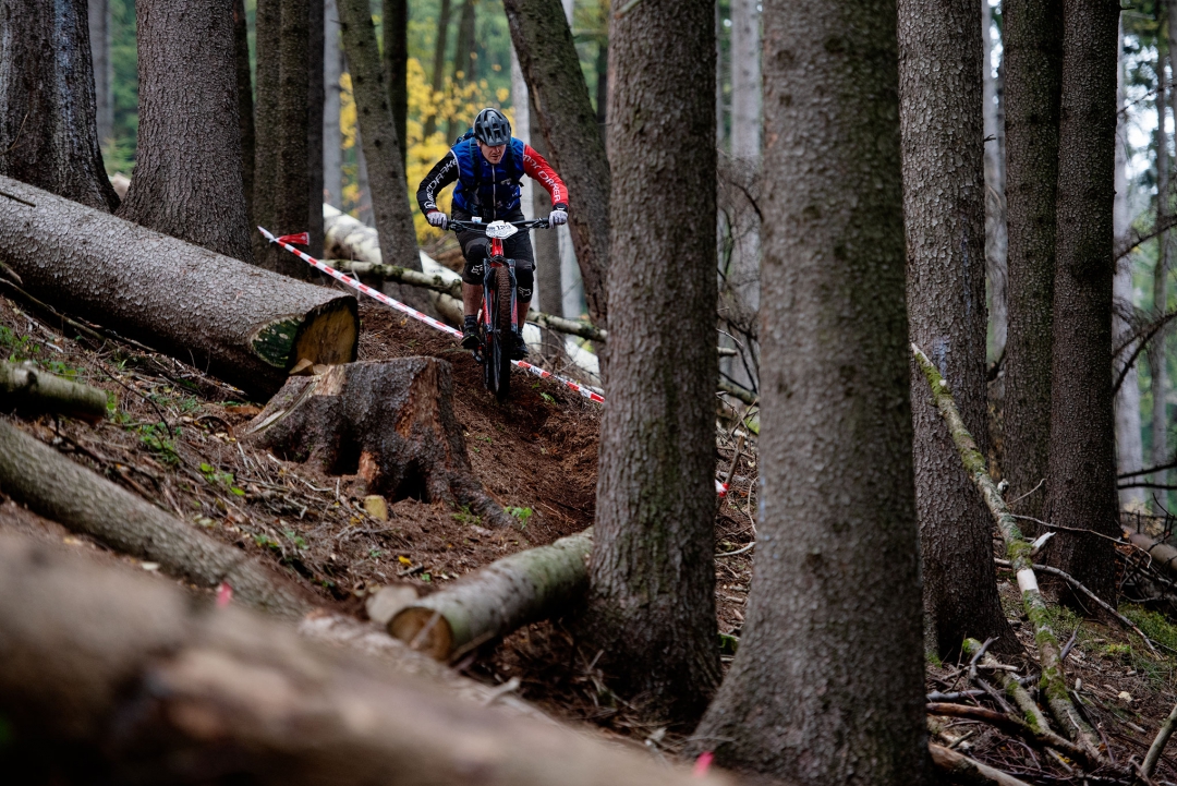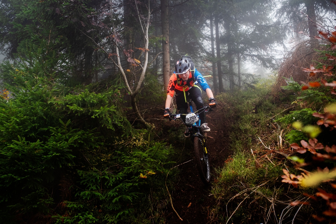 Zpátky nahoru to trochu štípne, dojde i na tlačenku. Počasí je ryze podzimní. Vršek kopce oba dva dny schovanej v mlze, ze zbarveného listí kape voda a kořeny kluzké. Vlhkost atakuje hranici 100%, brýle se mlží. Teplota někde okolo desítky, možná lehce nad, tak není na co čekat a už startujem do dvojky. Pár desítek metrů palba po rovné pěšině. Pak pravá devadesát do borůvčí. A tam hodně moc překvapení v podobě pařezů a kamenů. No ty kráso, že by návrat k HC Blinduro na Plešivci? Kdepak, toto není HC, toto se dá. A docela to baví a hlavně jede. Borůvčí mezi smrčkama je ale jen první třetina, přichází druhá – namotaná mezi stromy, hodně uzavřený točky, hledání ideální lajny, tady to chce srdíčko a prostě to tam poslat. A to už jsme ve třetí části erzety, kde to chytá konečně flow a tepovka atakuje maximálku. Závěr opět víc techničtější, ale bez nečekaných pastí. Opět dobrá práce.