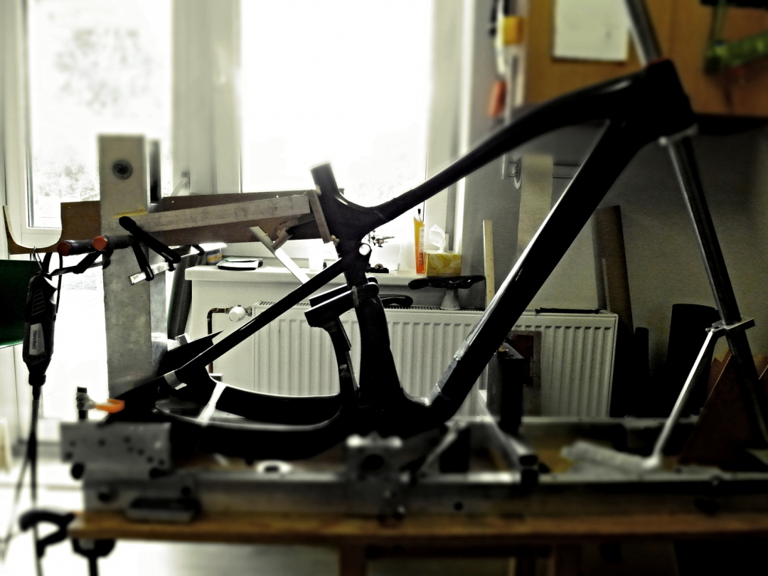 První krok je vyrobit mírně odlehčený přední rámový trojúhelník. Formu tu mám už několik let, takže pohoda. Jen ve formě zaslepit pozice pro ložiska, čepy zadní stavby a přepáku. Po odformování předního trojúhelníku nastává ta dramatičtější část. Prostě beru mikrobrusku, diamantový kotouč a na třech místech rám řežu. Poté ustavit v rámové stolici s novou geometrií. Delší reach, postavenější sedlovka, stejně tak hlava, střed níž.