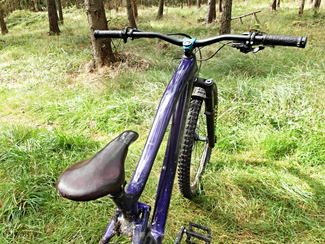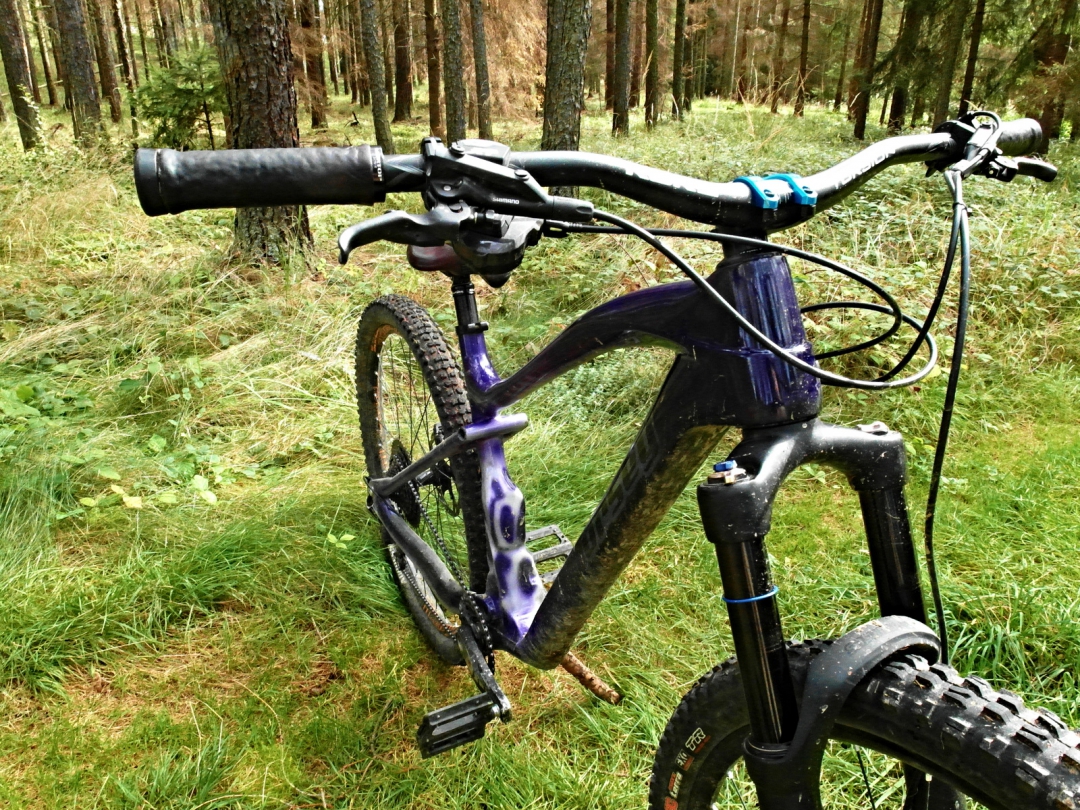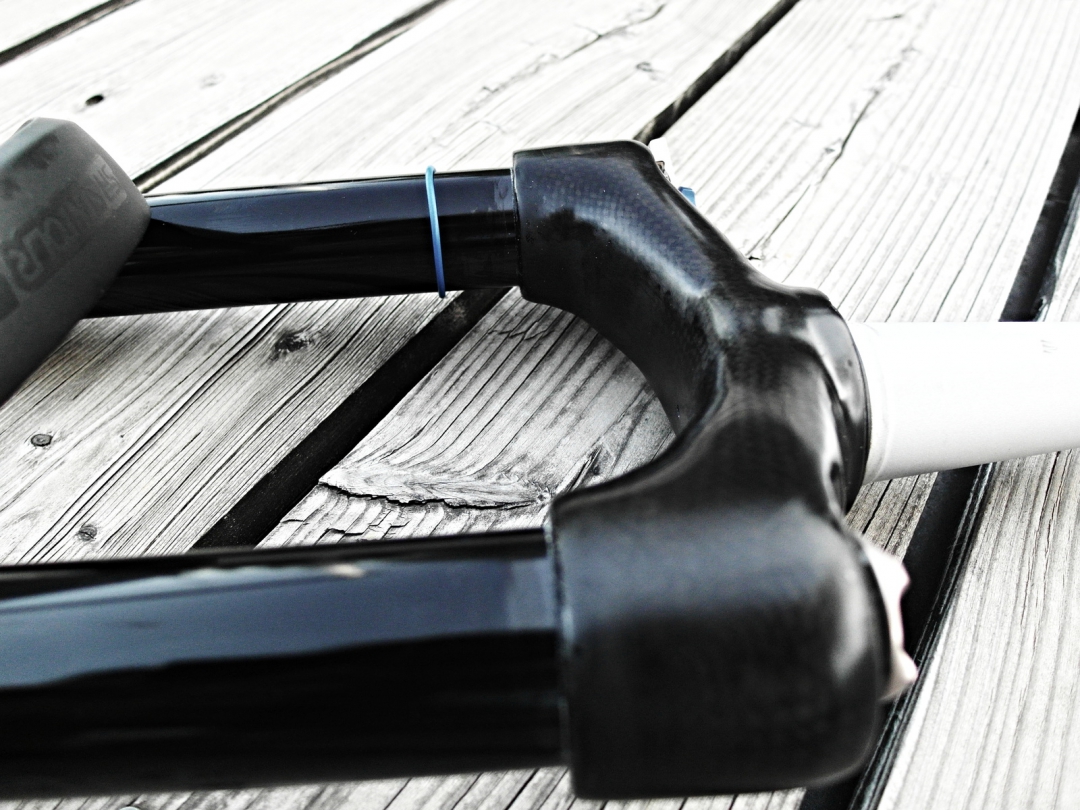 Když jsme u sedlovky, pojďme kouknout ještě trochu výš. Pozornému oku zřejmě neuniklo prapodivné sedátko. To je také vlastní výroba. Karbonová skořepina, s flexibilní dosedací částí. Částečně potažené vepřovou kůží, stejně jako gripy. Kůži na gripech jsem chtěl zkusit už dlouho. Myšlenka, že by nemusely klouzat i přes absenci rukavic se zpocenou rukou se potvrdila. Navíc na rozdíl od gumy nešpiní.