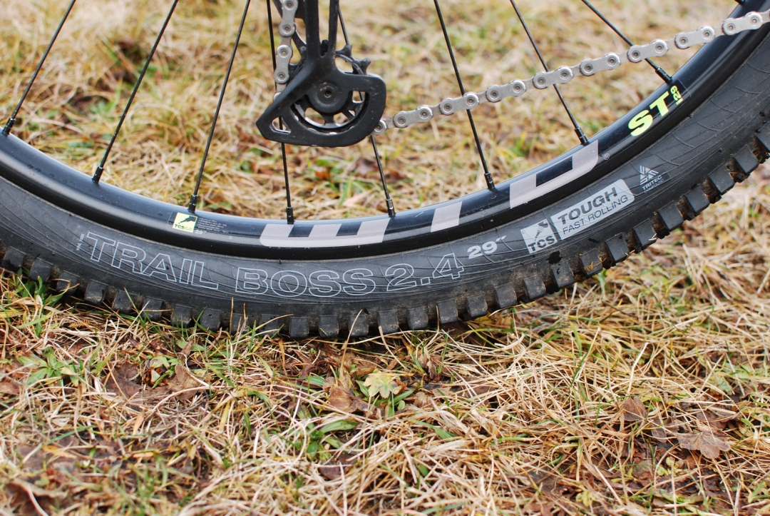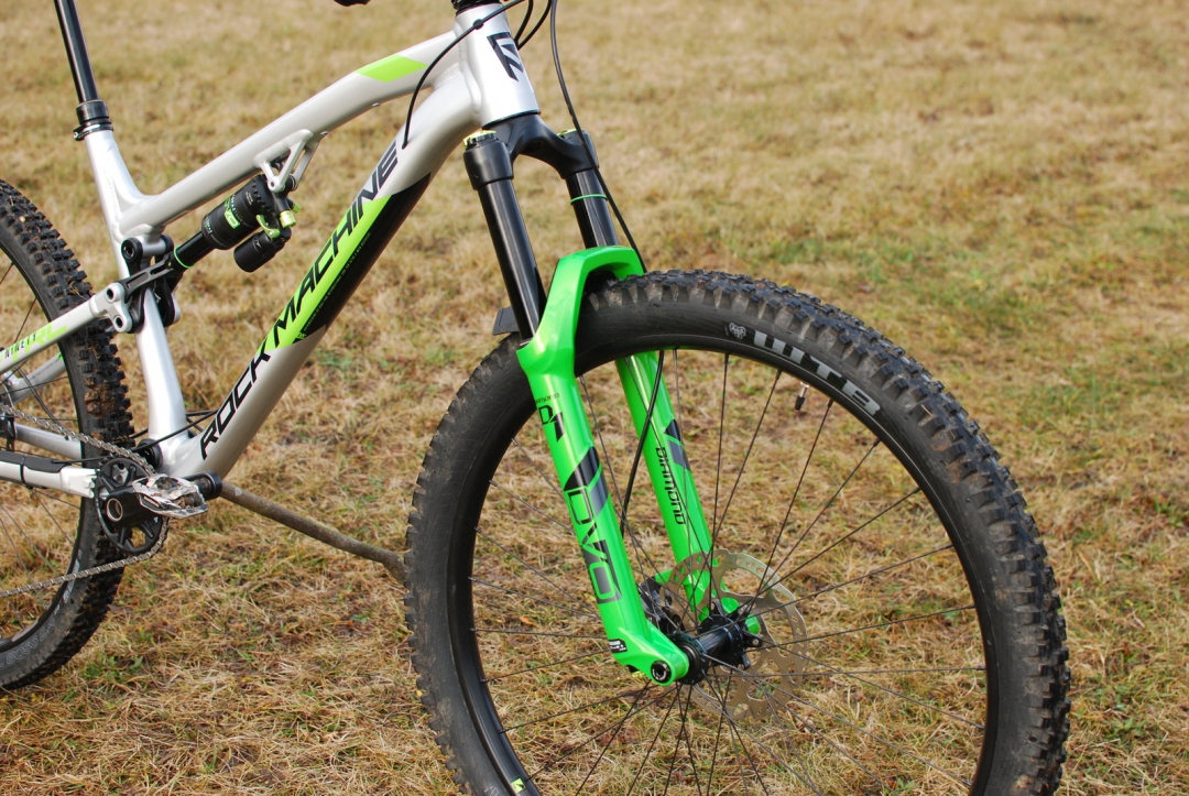 Vliv na pocit jezdivosti mají určitě i použité pláště Wtb. Zadní Trail Boss 2,4 je dost jezdivý a dobře se odvaluje. Vepředu mu sekunduje Vigilante v šíři 2,5 palce, ten zase dobře vede. Zvolená kombinace je z mého pohledu naprosto dokonalá vzhledem k určení kola. Pochvalu navíc zaslouží i použití zadního pláště s boční výztuhou – Tough nápis to potvrzuje. Rock Machine plášť použil i přesto, že váha této zesílené verze je o cca čtvrt kila vyšší než obyčejného „papíráku“.